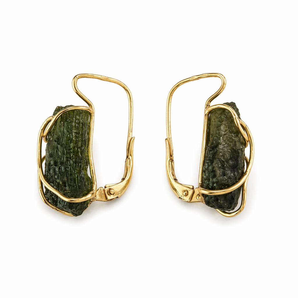 Tyto originální zlaté náušnice spojují syrovou krásu přírody s jemnou šperkařskou elegancí. Dominantou jsou pravé, neopracované vltavíny s typickou plastickou strukturou a hlubokým zeleným odstínem, který vyniká při každém dopadu světla.