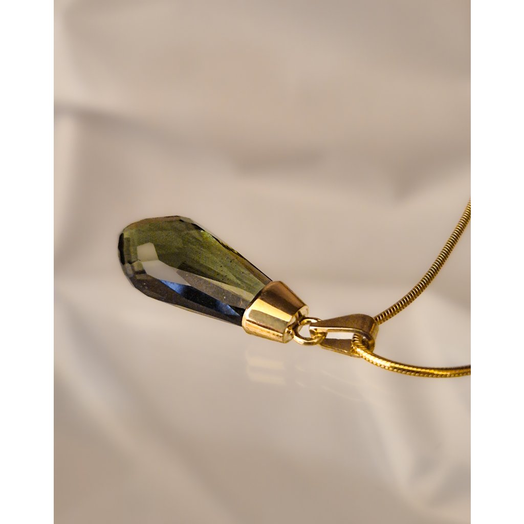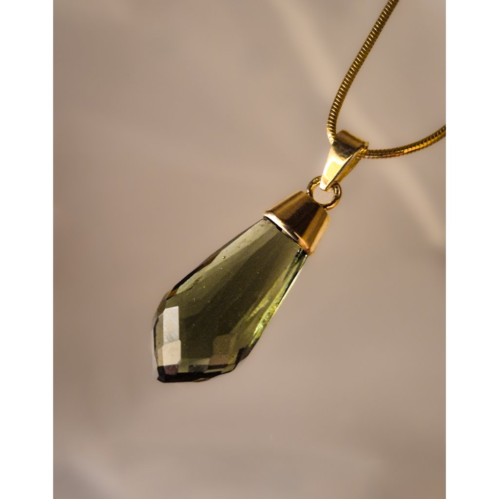 Zlatý přívěsek s broušeným vltavínem ve tvaru kapky – nadčasový šperk, který vyzařuje sofistikovanost, vzácnost a vesmírnou sílu tohoto přírodního drahokamu.