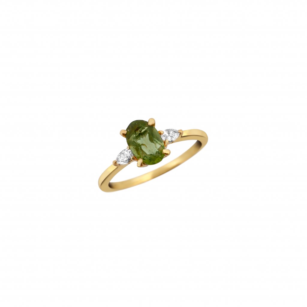 This fine gold ring with Moldavite and diamonds is the perfect expression of elegance and luxury. Made of high quality gold, this ring is designed to attract attention and emphasize the delicate beauty of every woman.