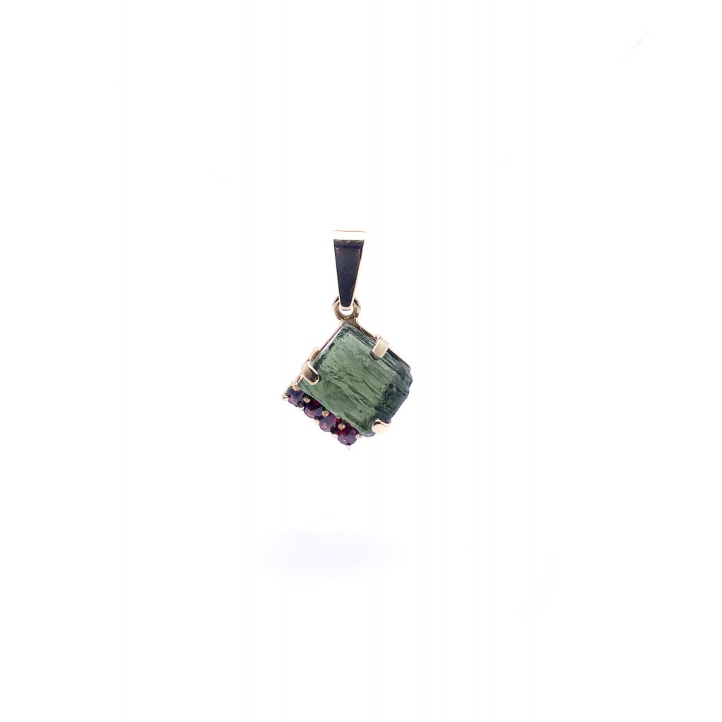 Moldavite pendant in gold with garnet 2000266590008