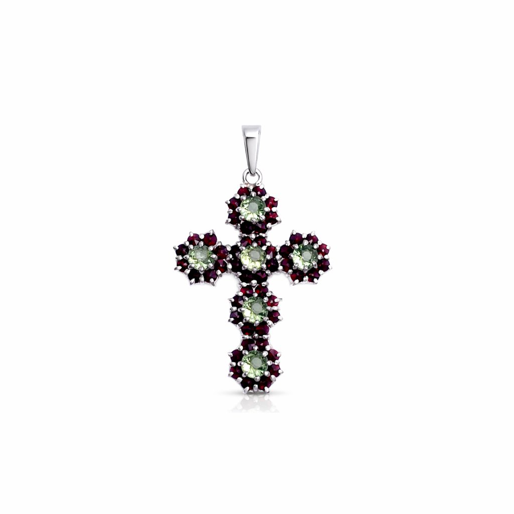 Silver pendant cross with cut Moldavite and garnets 2000185340005