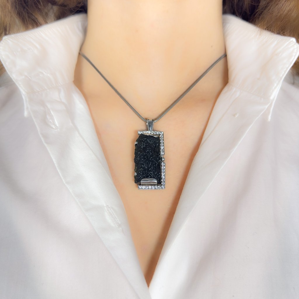 Silver pendant with raw vltavatine and zircons 2000150900005