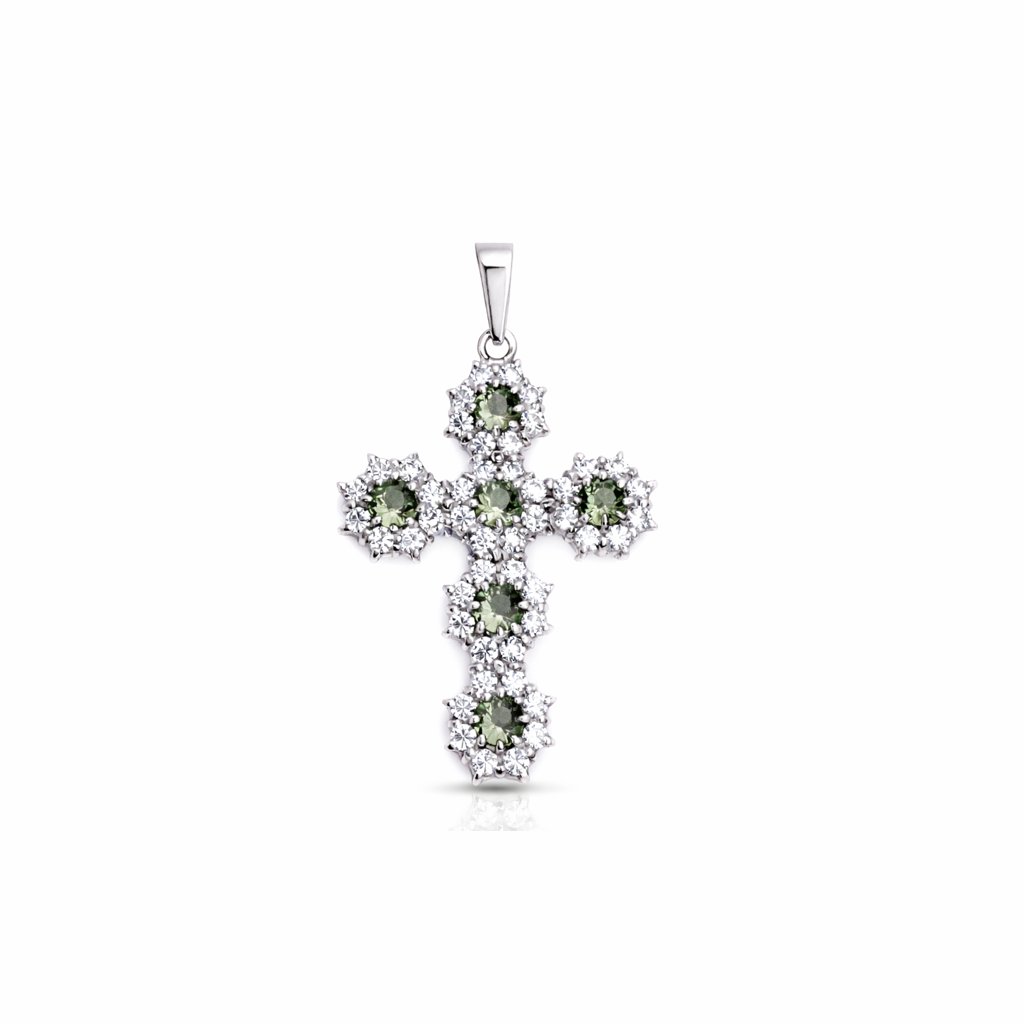 Silver cross pendant with cut Moldavite and zircons 2000185340005