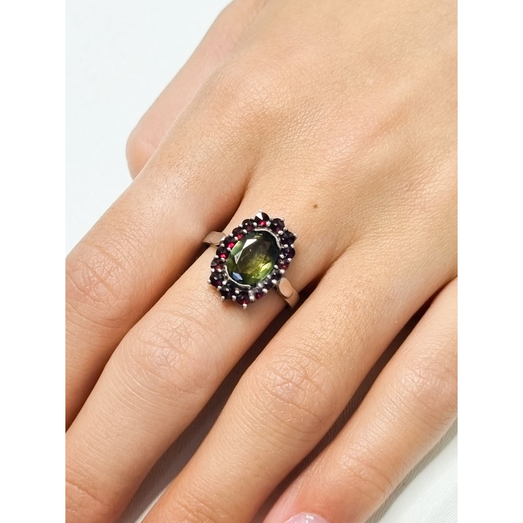 Moldavite ring in silver with garnet 2000288940003