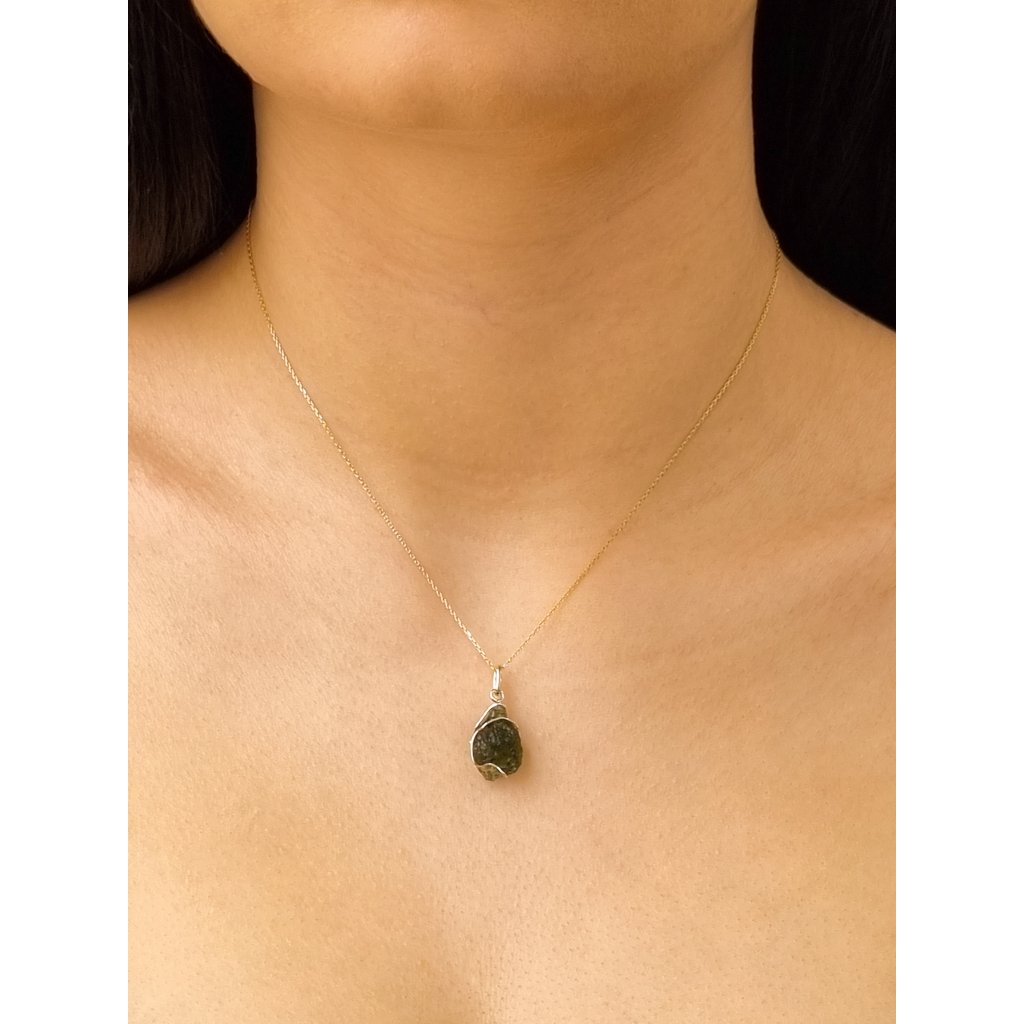 Double-sided pendant with distinctive sculpting of vltavín is a piece of jewelry that combines the power of natural stone with artistic design. A lighter green shade of vltavín. This jewel is a subtle stylish accessory for everyday wear.