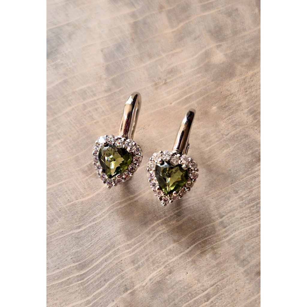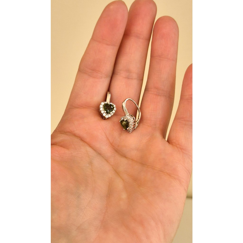 Stříbrné náušnice s vltavíny a zirkony, srdce