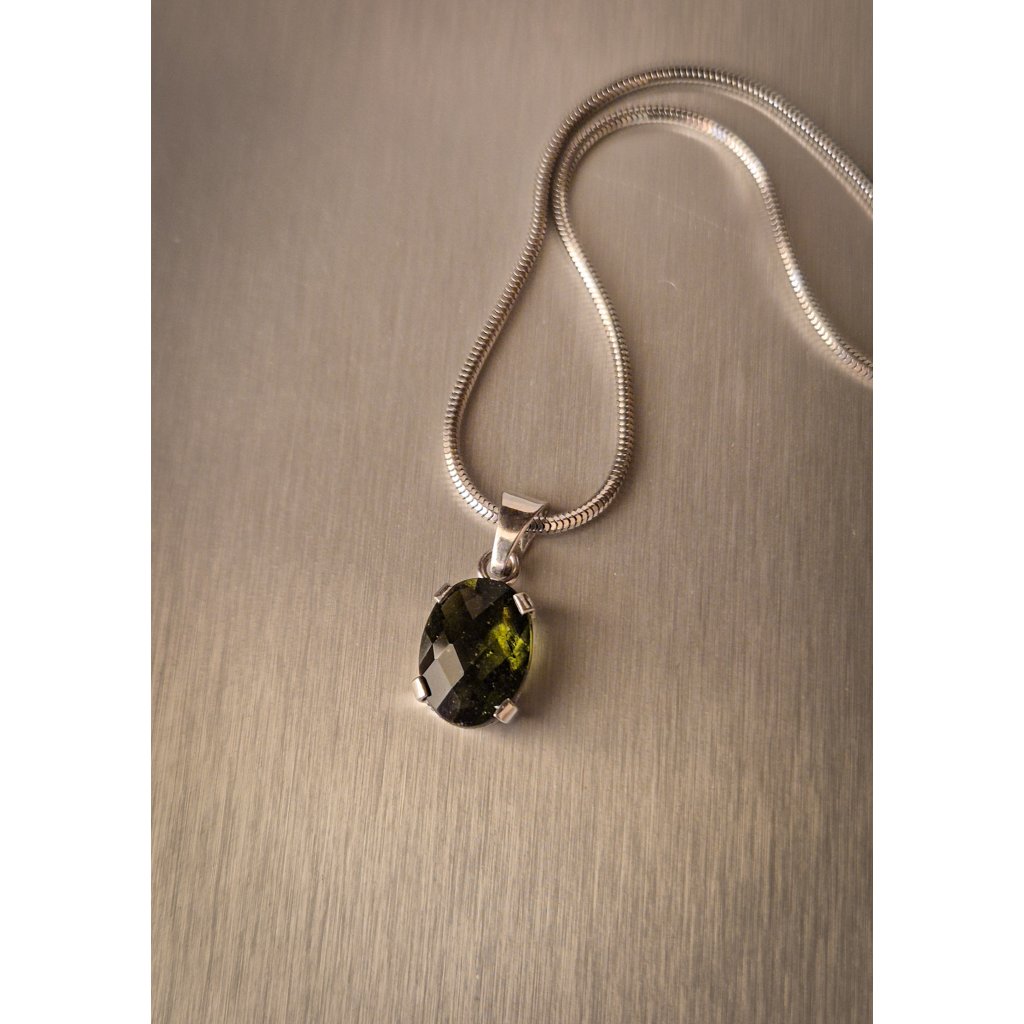 Silver pendant with oval cut Moldavite combines the elegance of natural Moldavite with modern geometric lines,