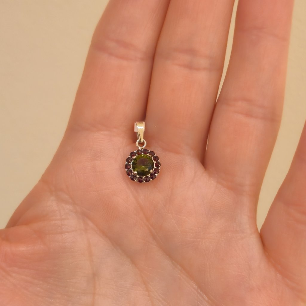 Stříbrný přívěsek s vltavínem a granáty P31 0054