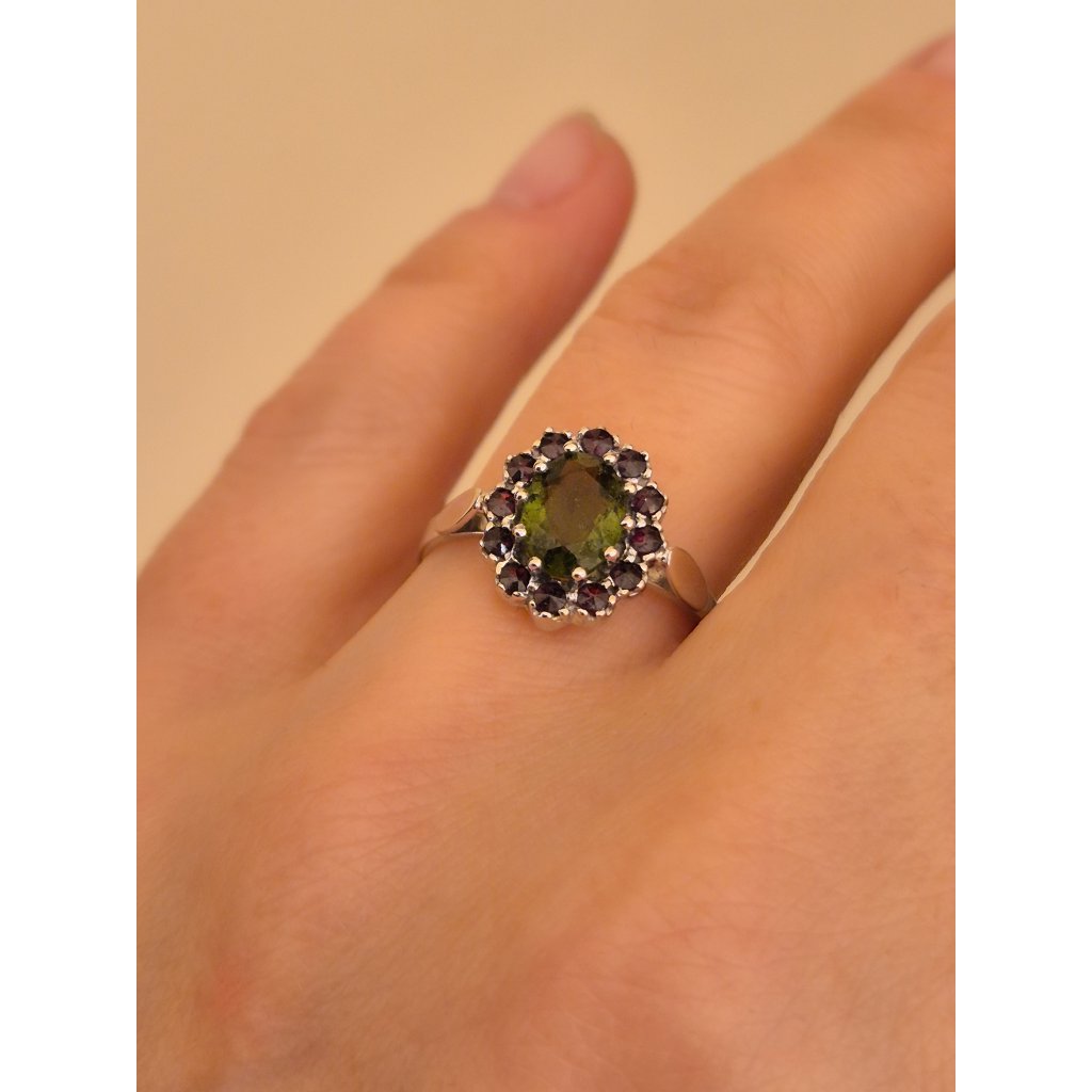 Stříbrný prsten s vltavínem a granáty P30 0086