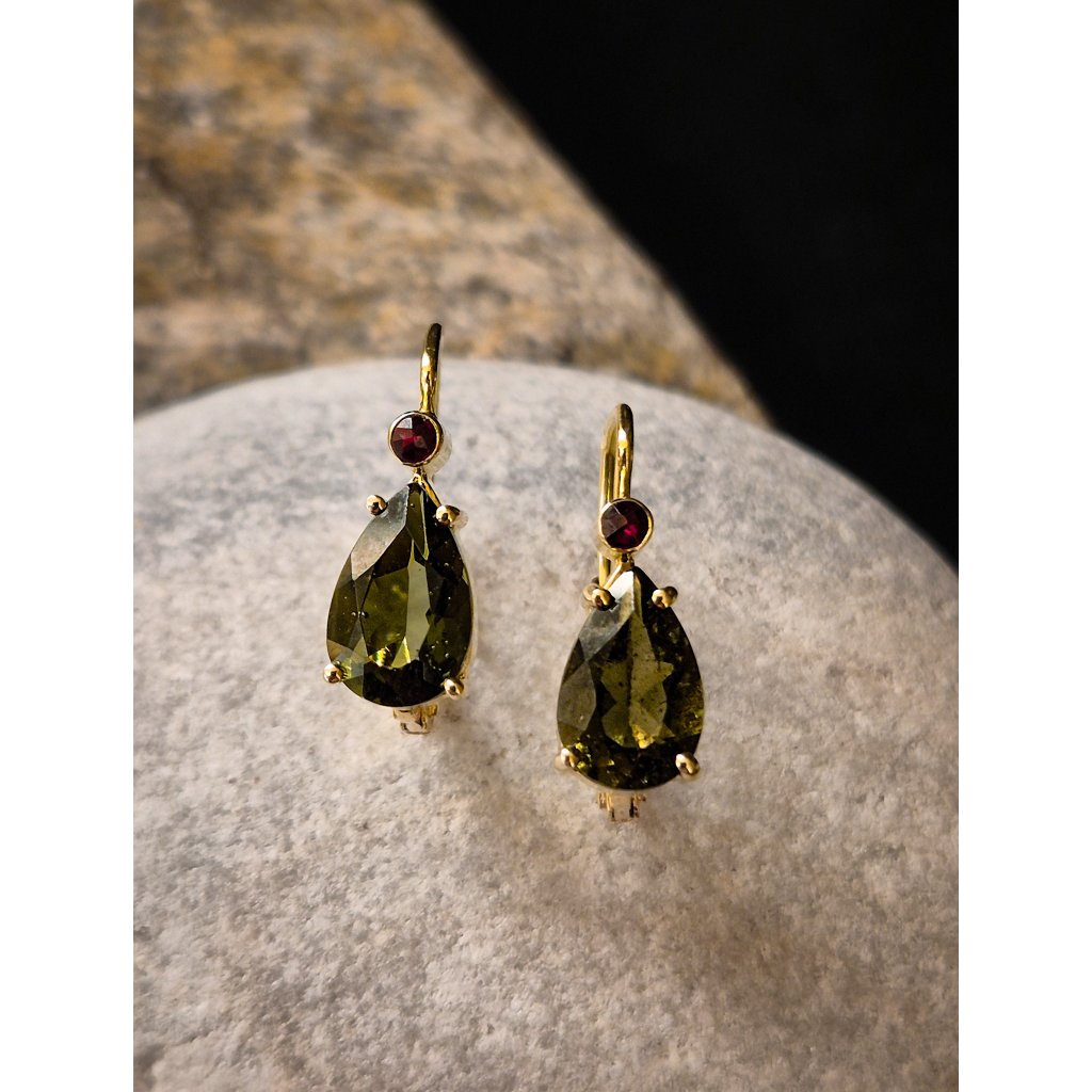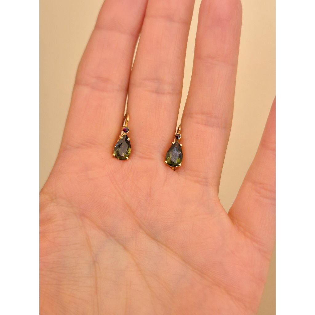 Zlaté náušnice s vltavíny a granáty P21 0110