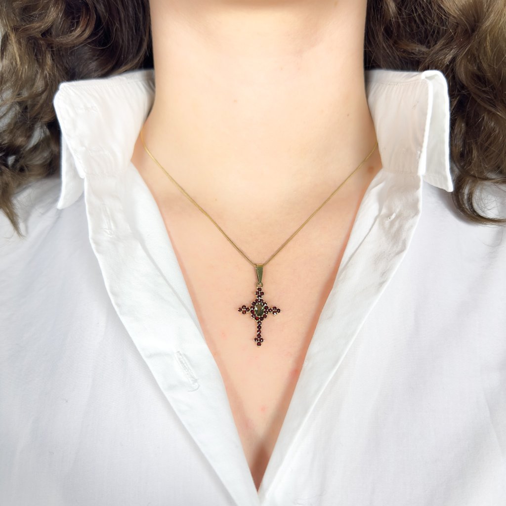 Gold pendant cross with Moldavite and garnets 2000185590004