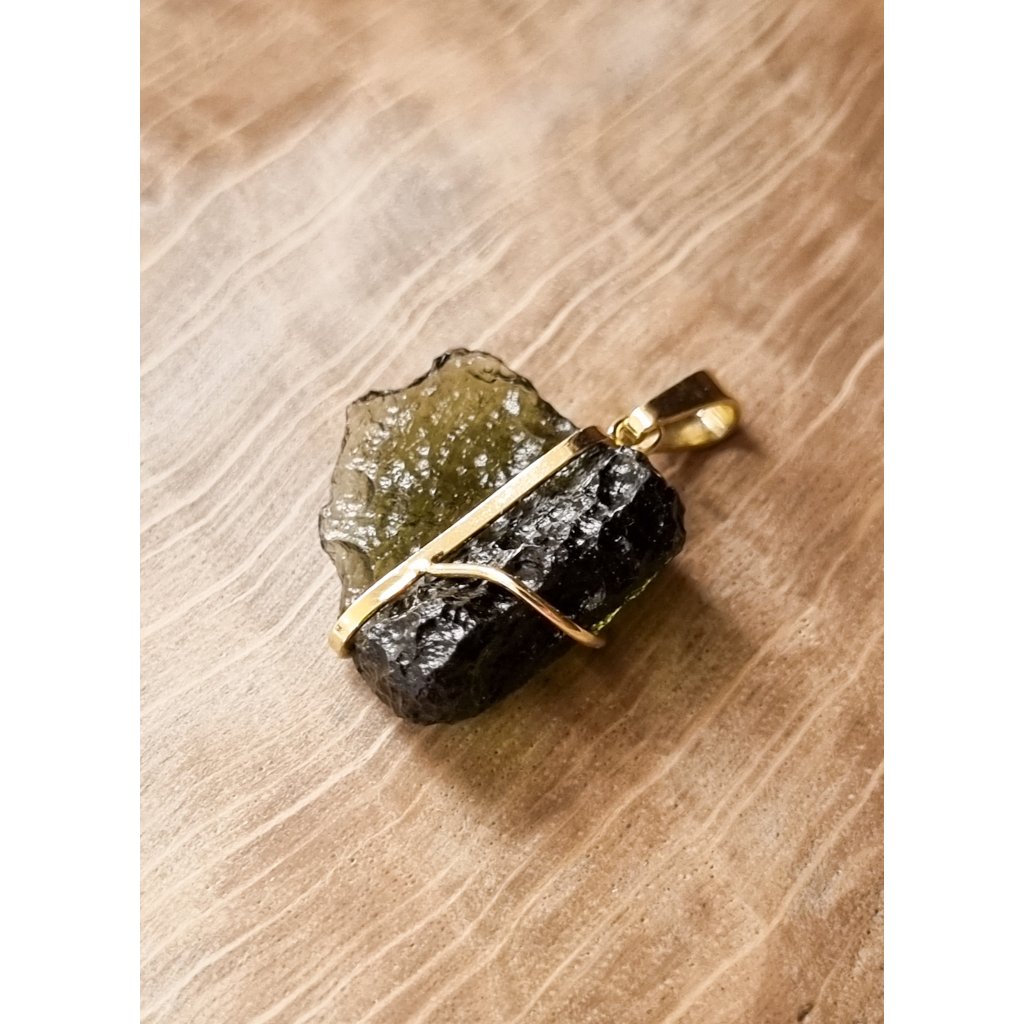 Modern gold pendant with uncut Moldavite, elegant and original. Handmade jewelry with a timeless design.