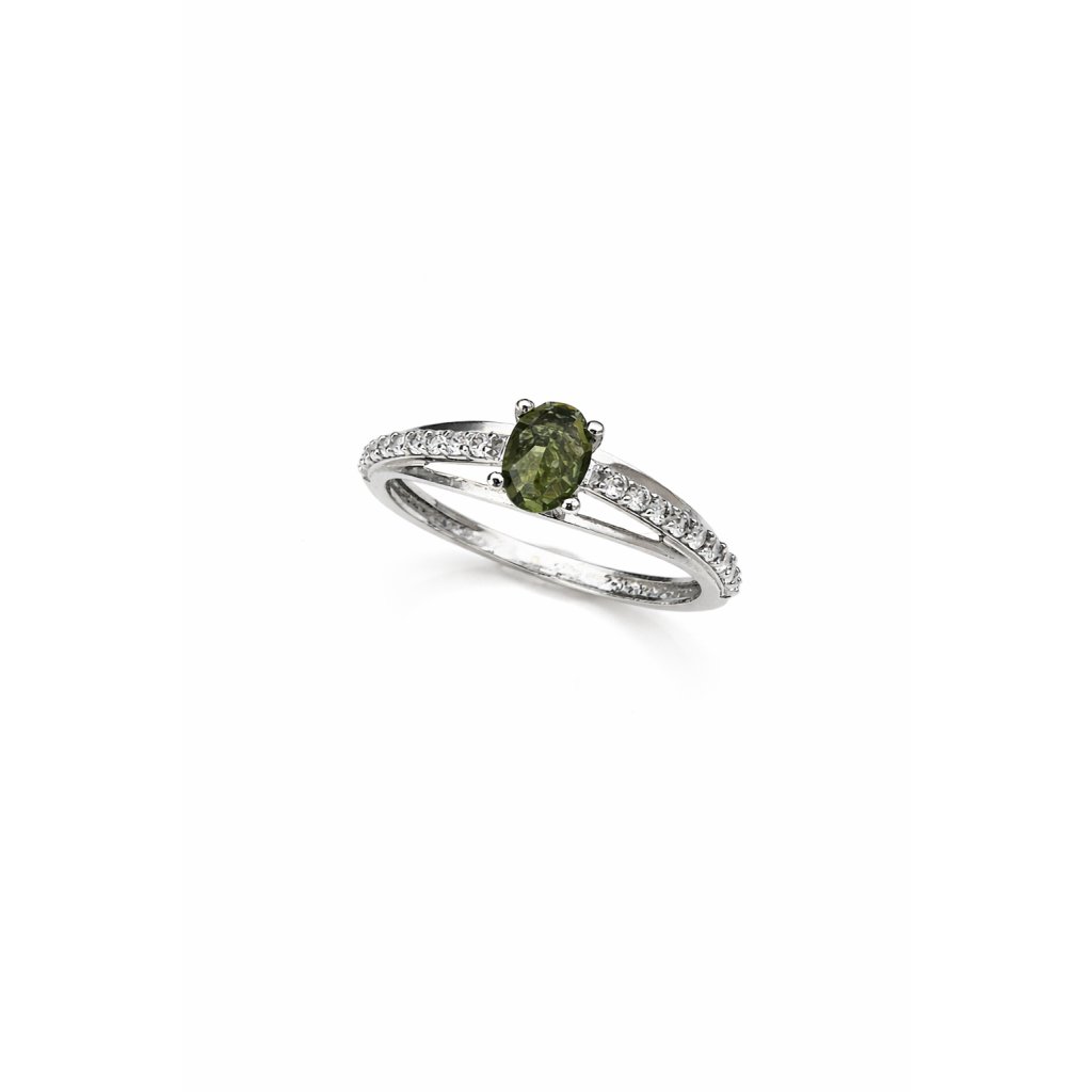 Gold ring with Moldavite and zircons P200021692008, white gold