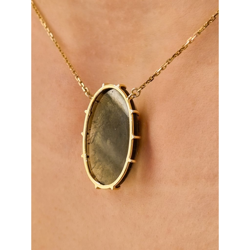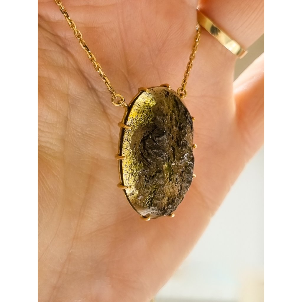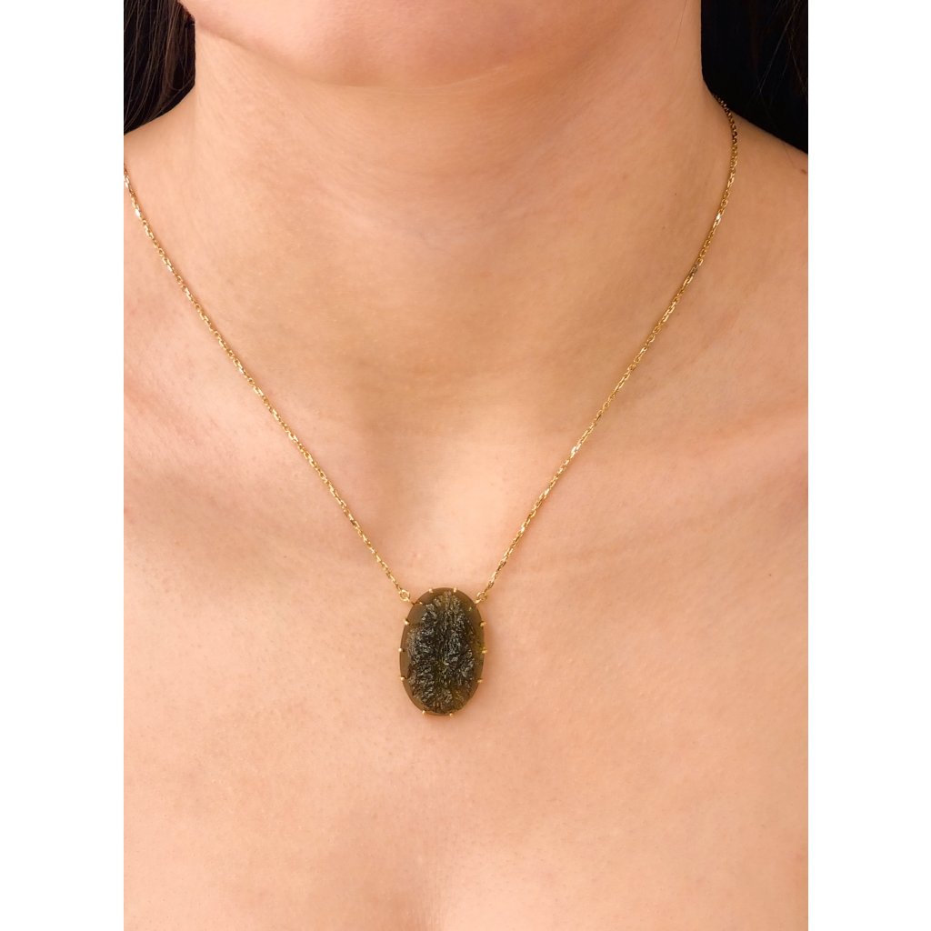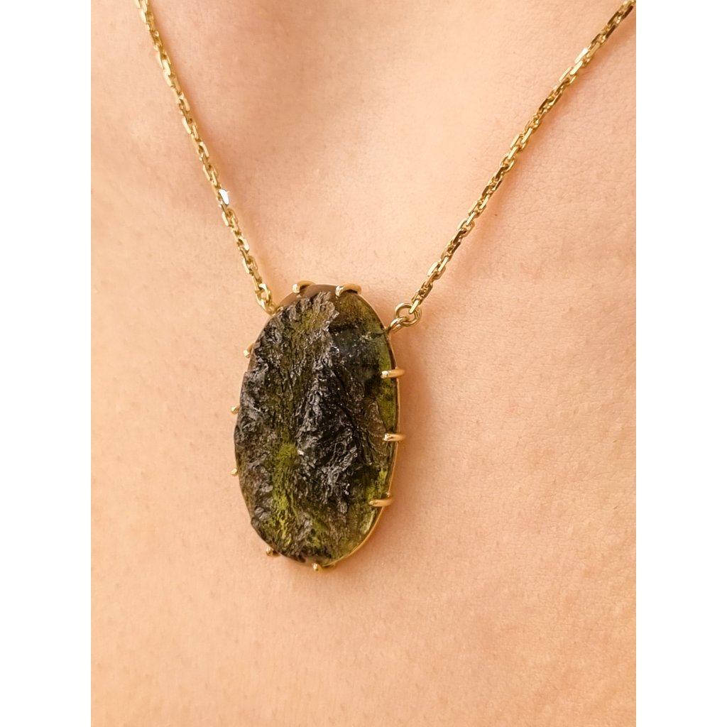 Exkluzivní zlatý náhrdelník s polobruskem vltavínu přináší dokonalé spojení luxusu a přírodní elegance. Jeho zlatý lesk a ohromující vltavín dodají vašemu outfitu nesrovnatelný šarm. Buďte středem pozornosti s tímto výjimečným klenotem.