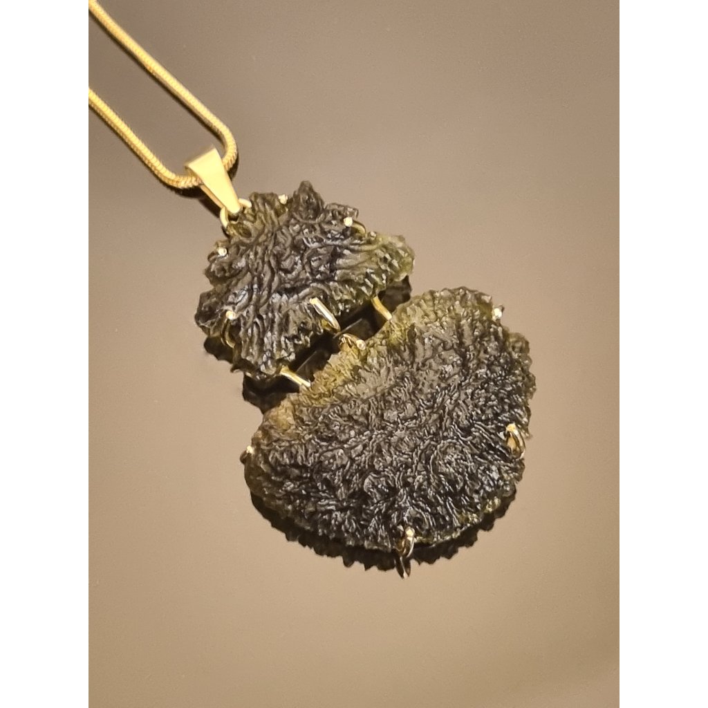 Tento ručně vyrobený zlatý přívěsek se dvěma nádhernými vltavíny je šperk, který si zaslouží být i dědictvím pro další generace.