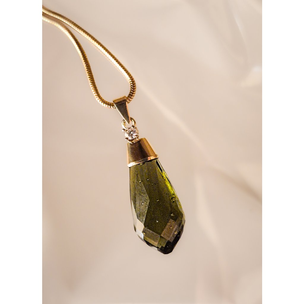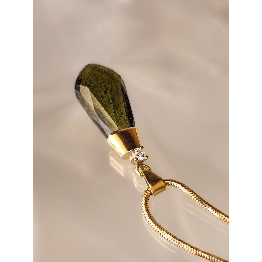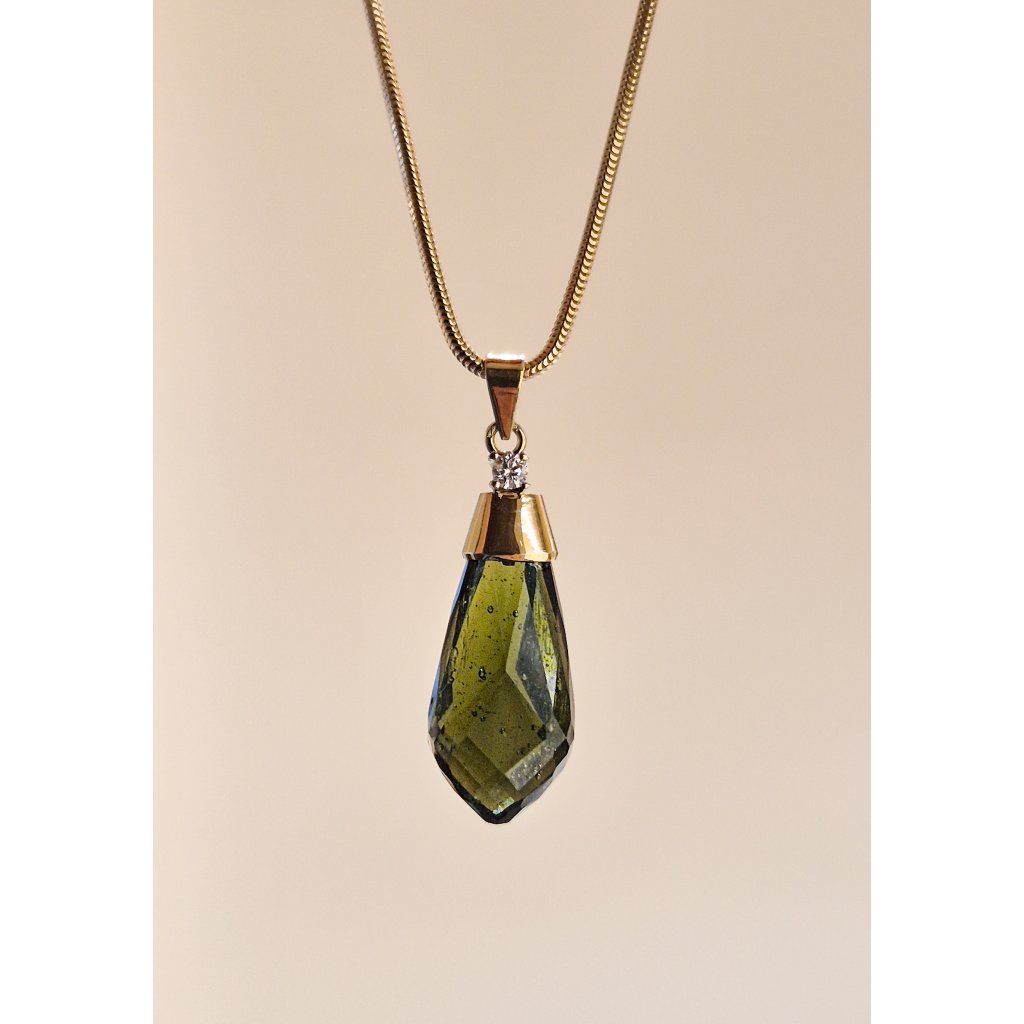 Objevte kouzlo dokonalého luxusu s tímto nádherným zlatým přívěskem, jehož srdcem je precizně broušený vltavín doplněný třpytem briliantu. Každá faseta ručně broušeného vltavínu zachycuje světlo a odhaluje jedinečnou hloubku a tajemnou zelenou záři tohoto vzácného drahokamu. Pečlivé zpracování v kombinaci s kvalitním zlatem vytváří harmonii mezi přírodní krásou a rafinovanou elegancí. Tento šperk není jen doplňkem, ale symbolem originality, sofistikovanosti a nadčasového vkusu. Buďte jedineční a nechte svůj styl zazářit!