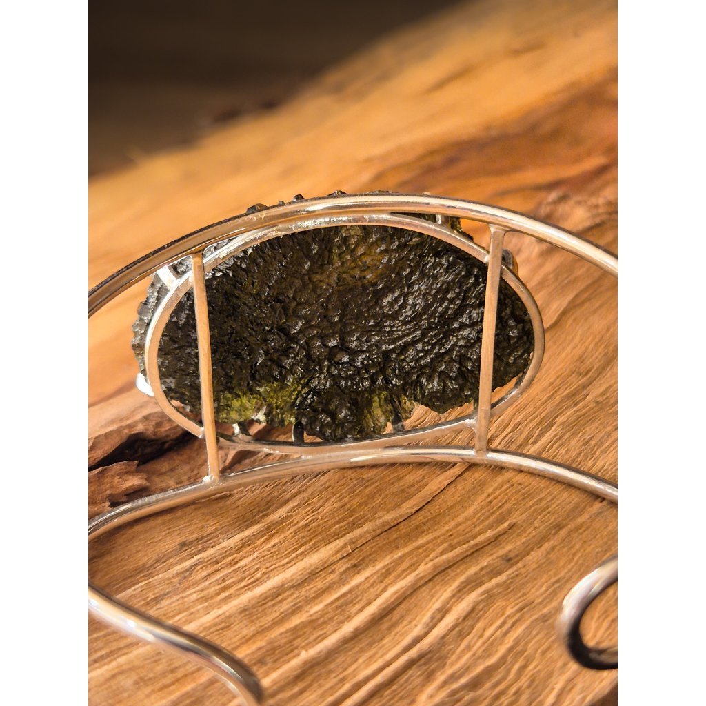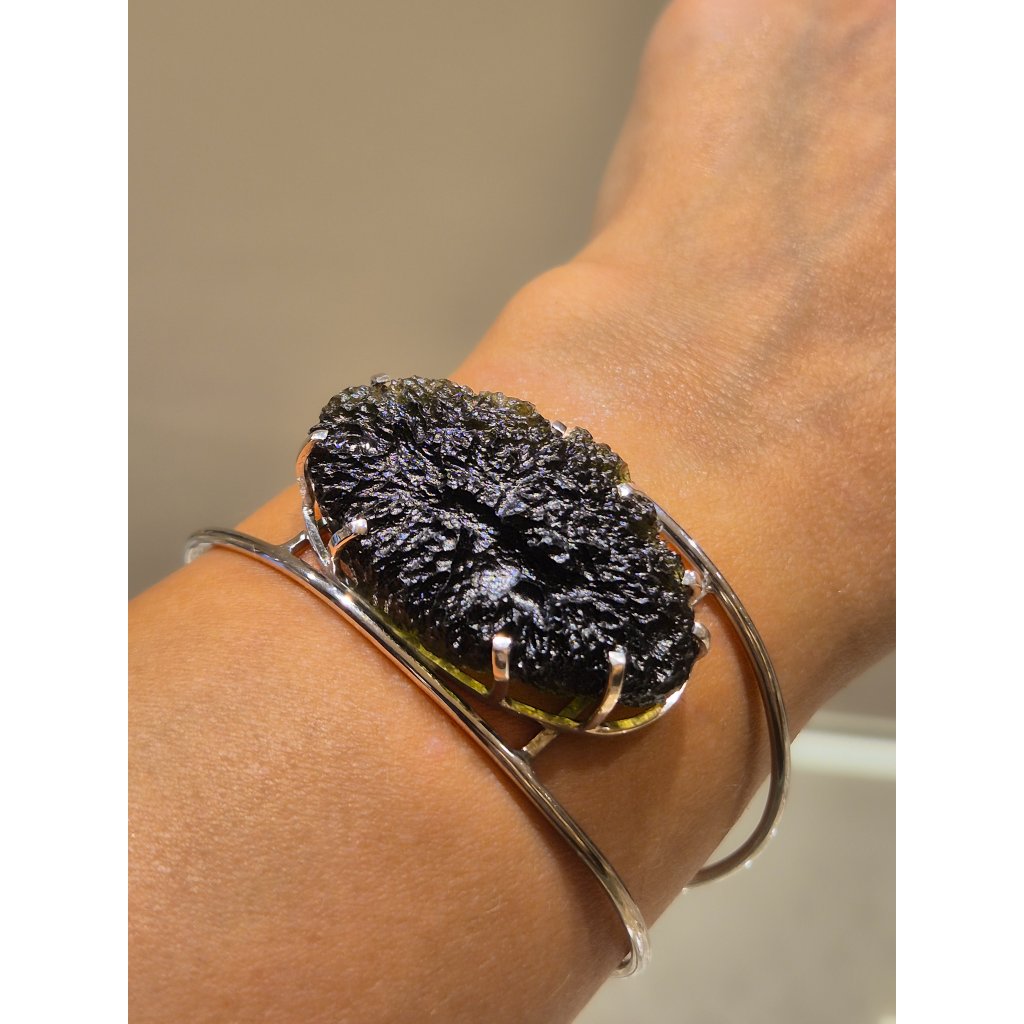 Unikát, který promlouvá – Velký náramek s nebroušeným vltavínem je silným symbolem osobní energie a výjimečnosti. Každý detail ruční práce z něj dělá opravdový solitér.