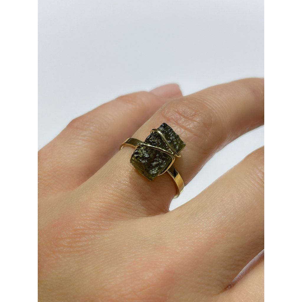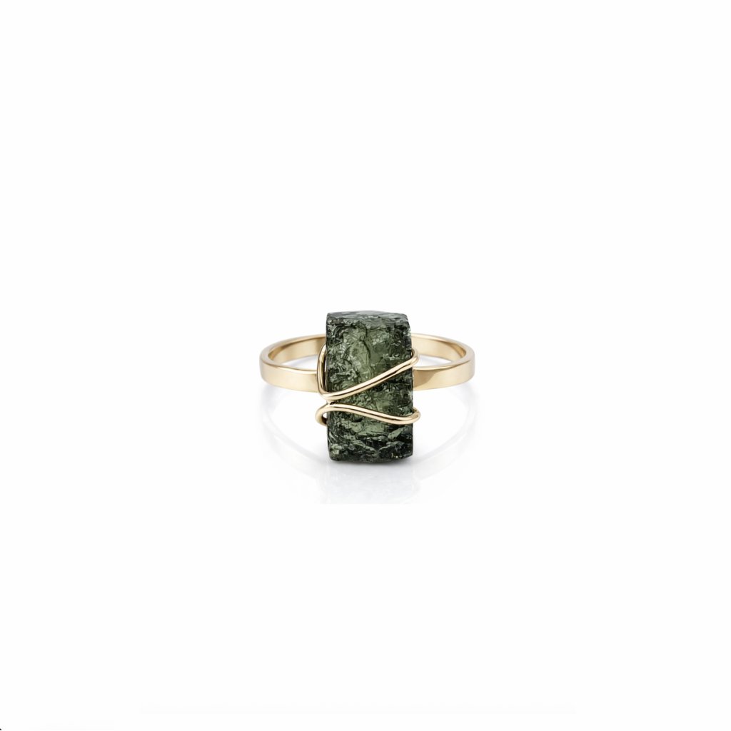 Zlatý prsten s výrazným surovým vltavínem obdélníkového tvaru, pevně uchyceným ručně tvarovanými zlatými linkami. Kámen má tmavě zelený odstín s bohatou přírodní strukturou a pro vltavín typickými reliéfy. Dominantní, nepřehlédnutelný a jedinečný!