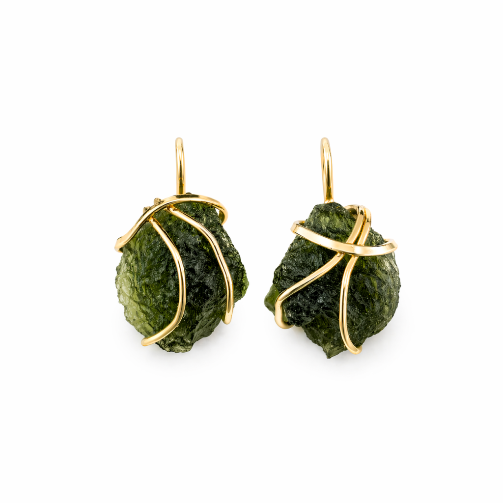 Tyto originální zlaté náušnice zaujmou na první pohled svým výrazným, téměř sochařským zpracováním. Dominantou jsou pravé, neopracované vltavíny s typickou plastickou strukturou, jemnými detaily a hlubokým zeleným odstínem, který odráží jejich jedinečný původ.