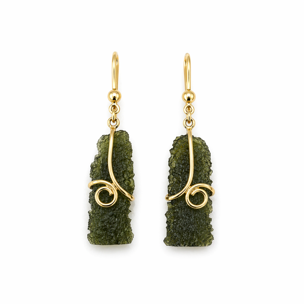 Tyto luxusní visací náušnice jsou ukázkou precizní šperkařské práce a citlivého zpracování přírodního kamene. Dominantou jsou krásné, přírodní vltavíny v neopracované podobě, které si zachovávají svou charakteristickou strukturu a hluboký zelený odstín.