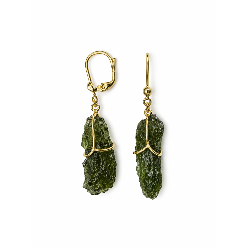 Zlaté visací náušnice s přírodními vltavíny – síla přírody v elegantním pohybu