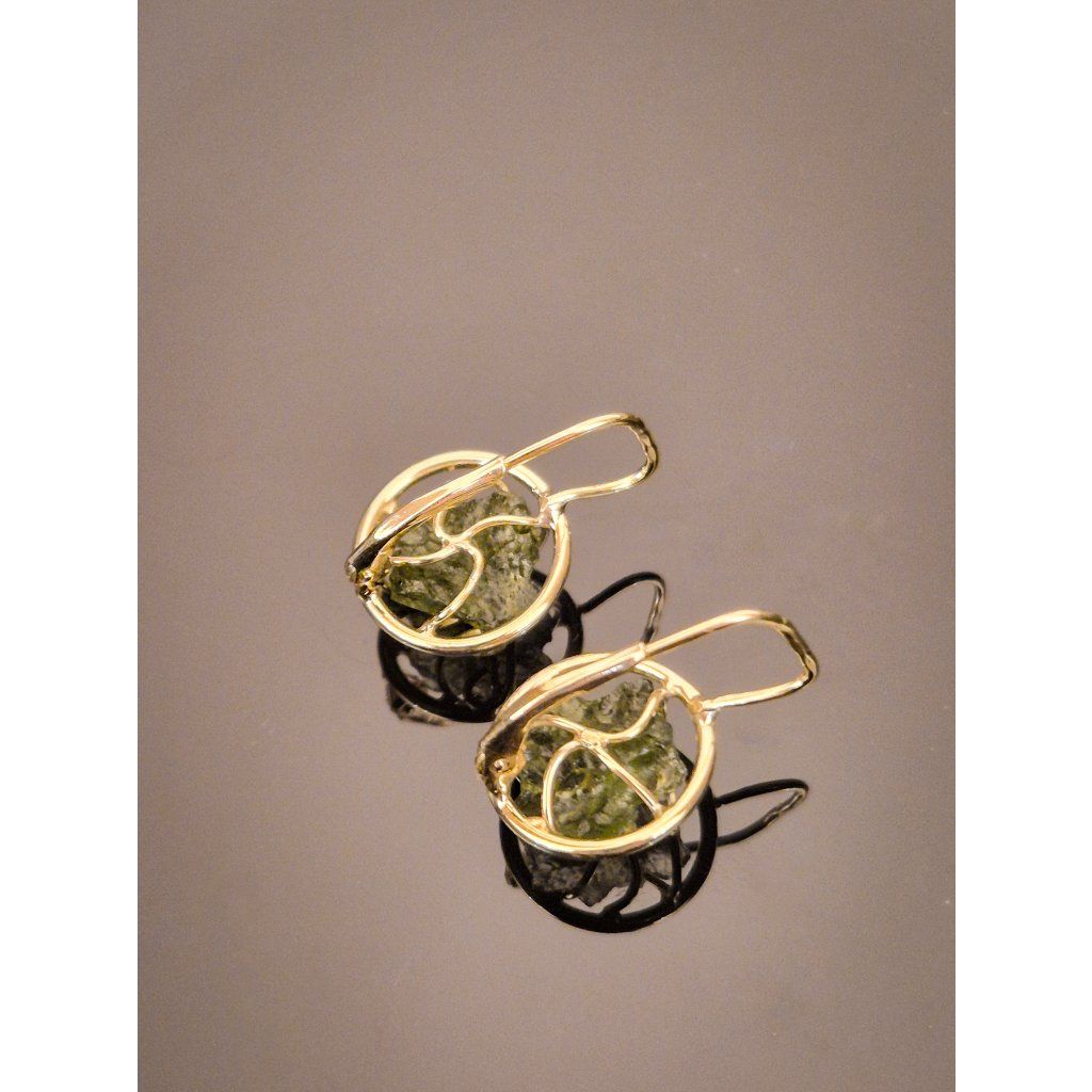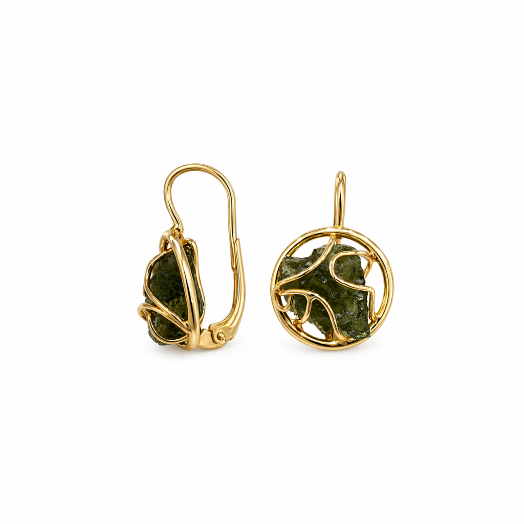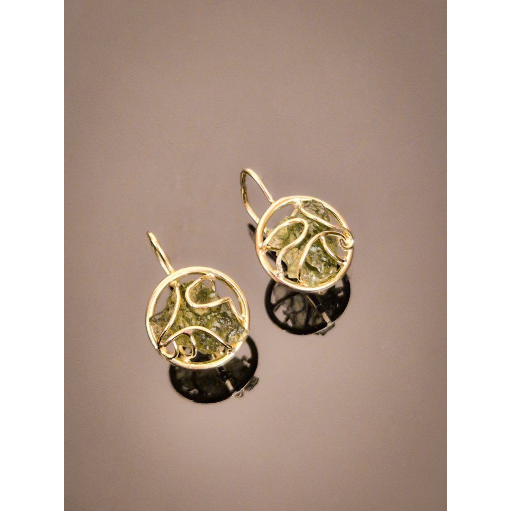 Zlaté náušnice s vltavíny – Exkluzivní náušnice kombinují zlato a vltavíny v jedinečném designu. Ruční výroba zaručuje originalitu a kvalitu.