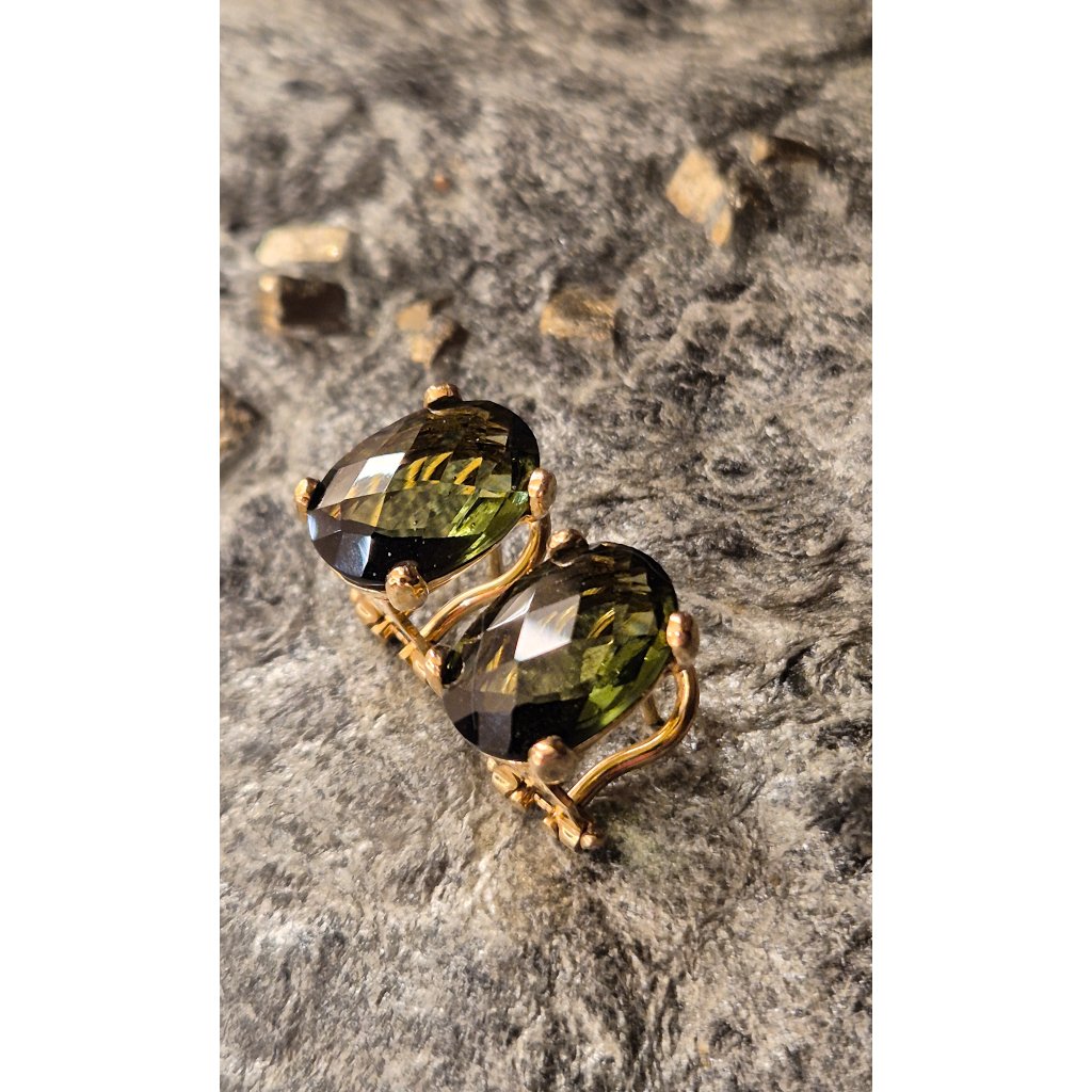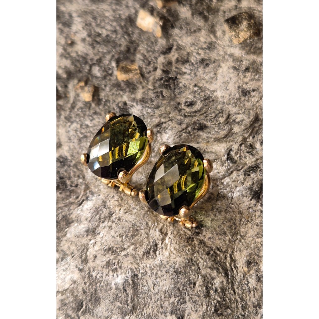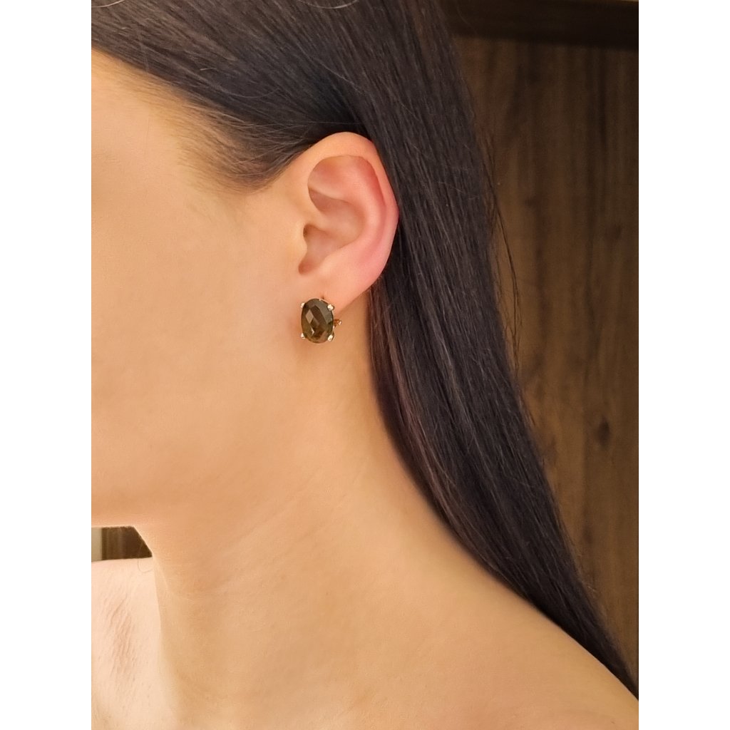 Zlaté náušnice s oválnými vltavíny šachovnicovvého brusu nabízejí luxusní vzhled. Akcent je kladen na kvalitu kamene a jednoduchý minimalistický design. Zapínání klip-štyft zajišťuje komfortní nošení. Projevte svůj osobní styl a eleganci s těmito exkluzivními náušnicemi, které se zaručeně stanou středem pozornosti.