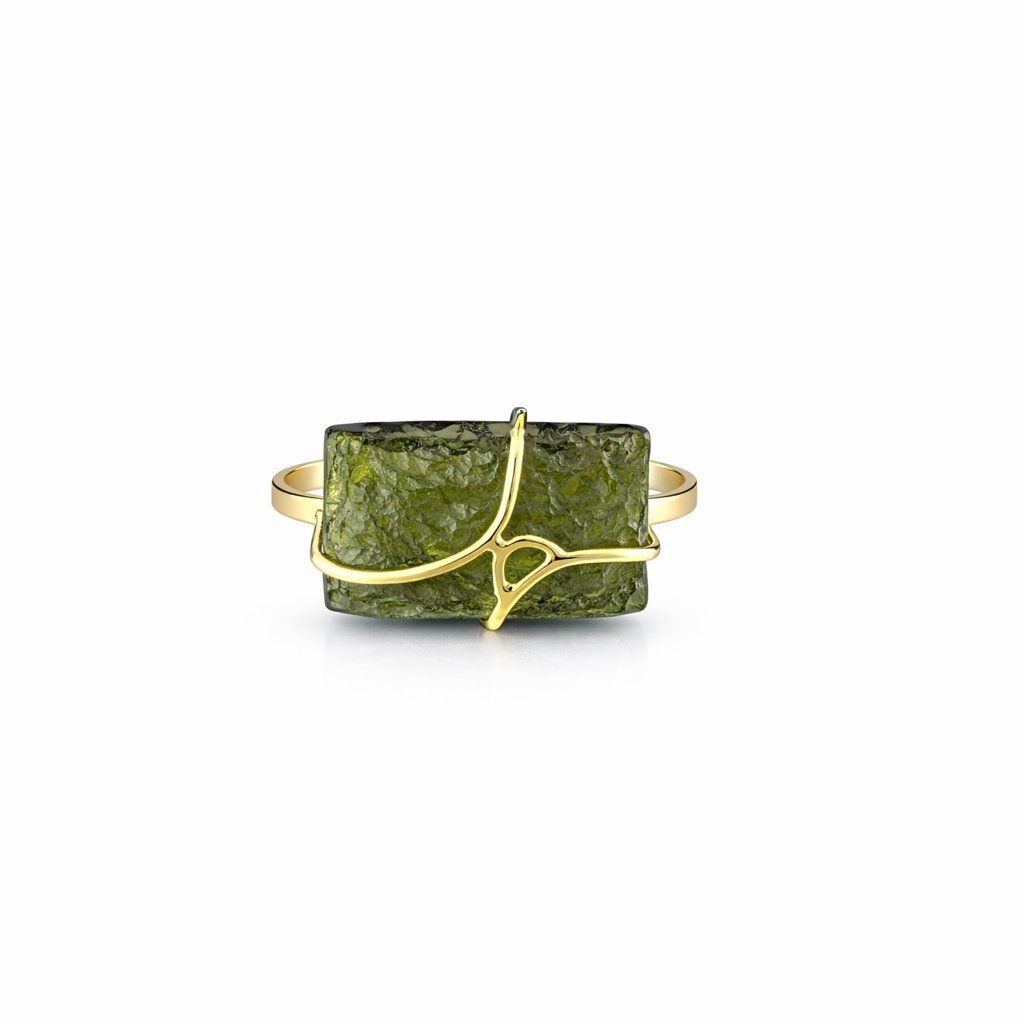 Výjimečný zlatý prsten s přírodním vltavínem, vytvořený v ČR s důrazem na tradici, kvalitu a detail.