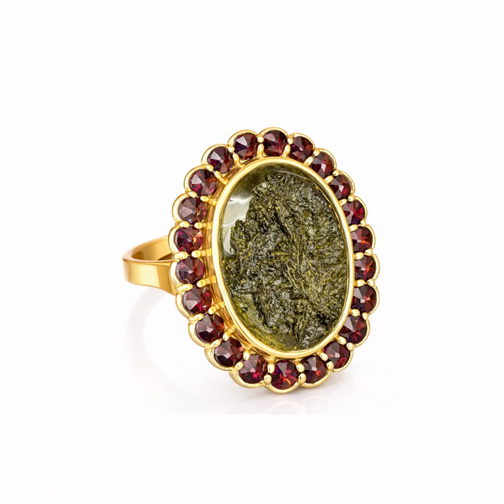 Luxus s příběhem – vltavín, zasazený do ušlechtilého zlata, obklopený zářícími granáty, tvoří jedinečný šperk.