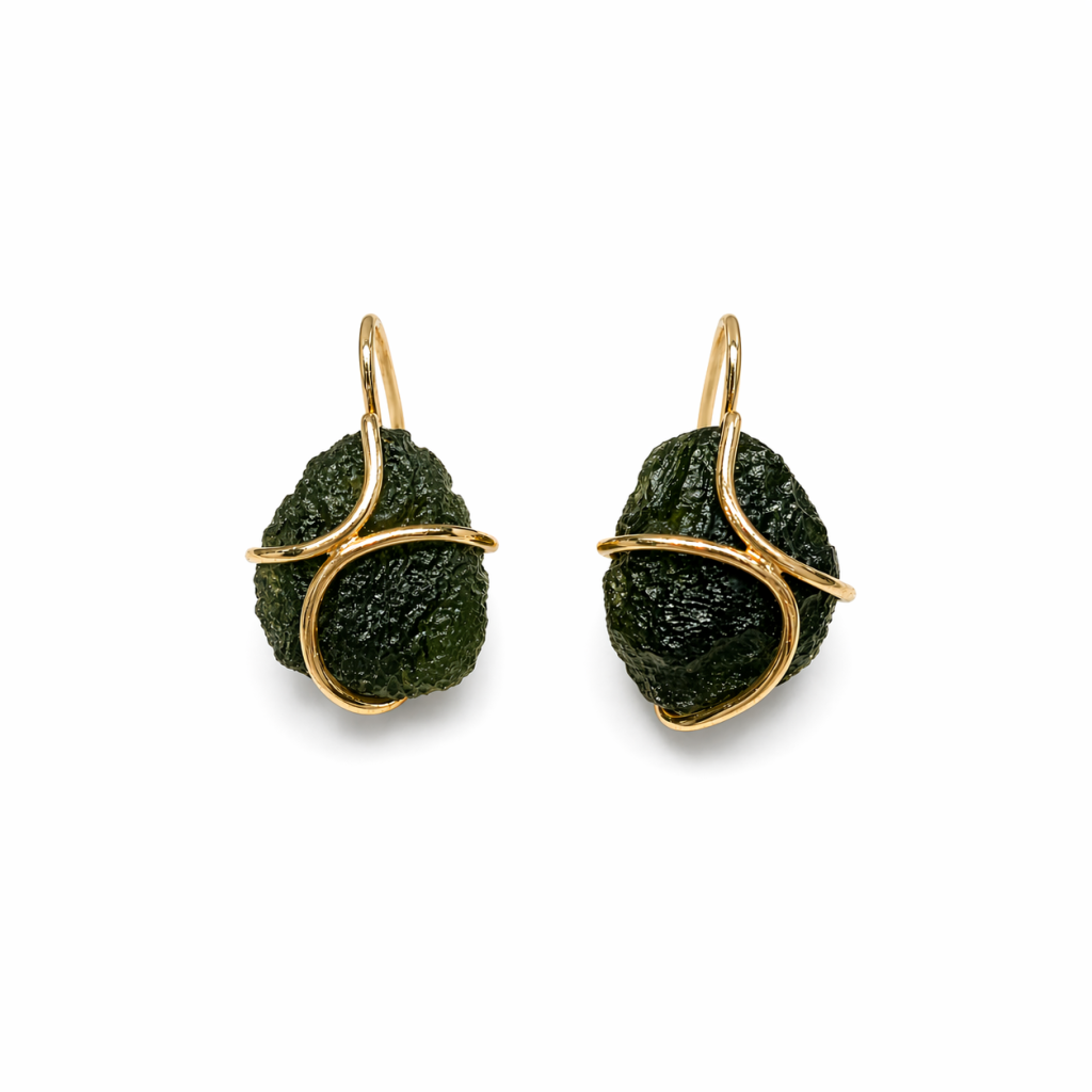 Tyto zlaté náušnice vynikají harmonickým spojením surové krásy vltavínu a plynulých linií zlata. Dominantou jsou pravé, neopracované vltavíny s typickou plastickou strukturou a hlubokým zeleným odstínem, který působí tajemně a luxusně zároveň.