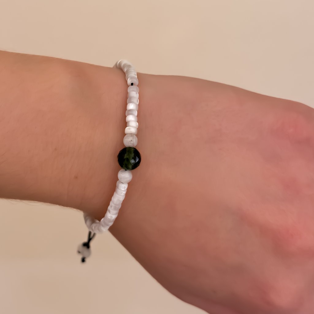 Jemný náramek s pravým vltavínem a perletí na nastavitelné šňůrce. Spojení síly země a jemnosti moře v minimalistickém designu, který podtrhne tvou přirozenou eleganci.