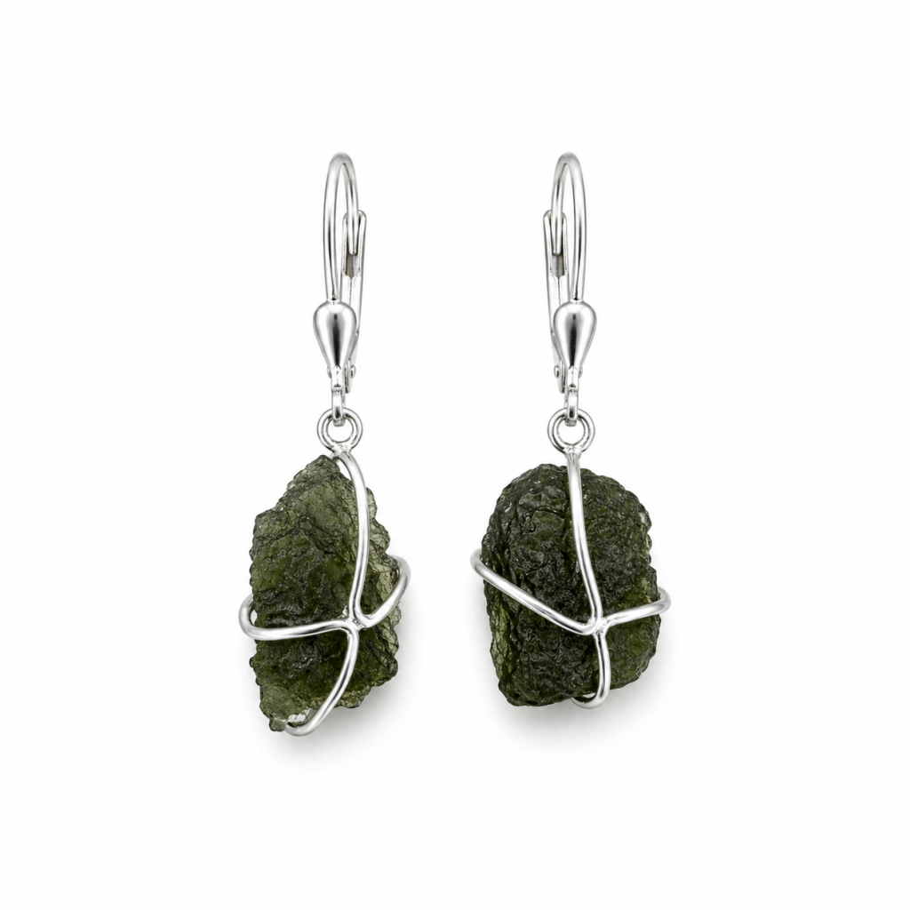 Tyto jemné stříbrné náušnice zaujmou svou čistotou a přirozeností. Dominantou jsou pravé, neopracované vltavíny, které si zachovávají svou typickou strukturu, organický tvar a hluboký zelený odstín.
