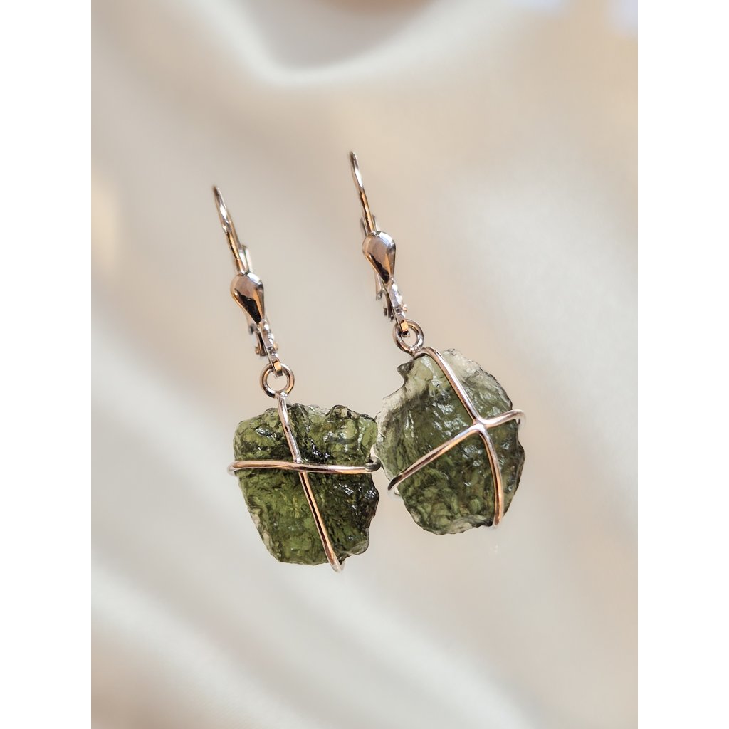Vltavín a stříbro – přírodní spojení, které nikdy neomrzí. Jemné visací náušnice ruční výroby.