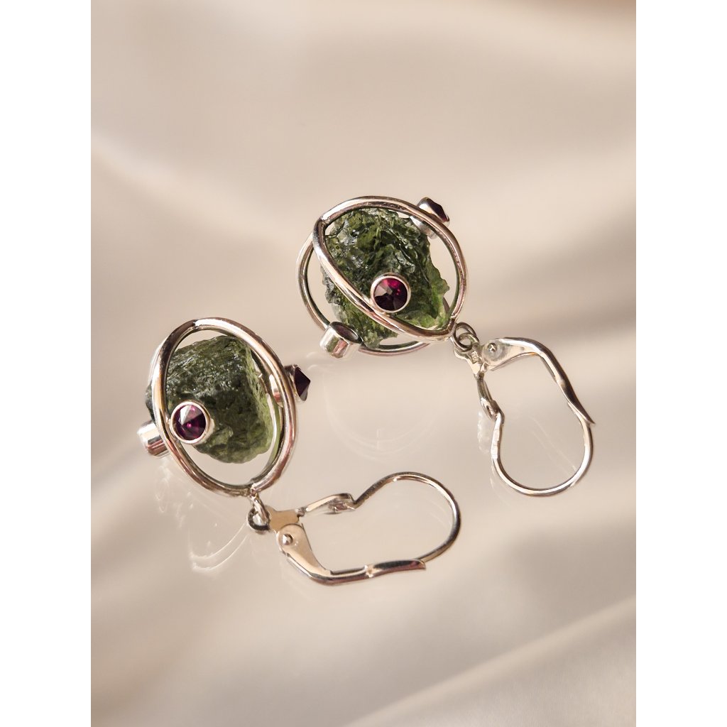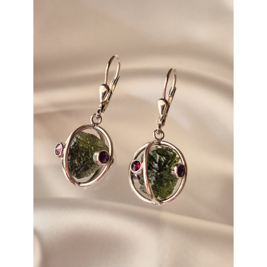 Stříbrné visací náušnice s vltavíny a granáty P36 0048