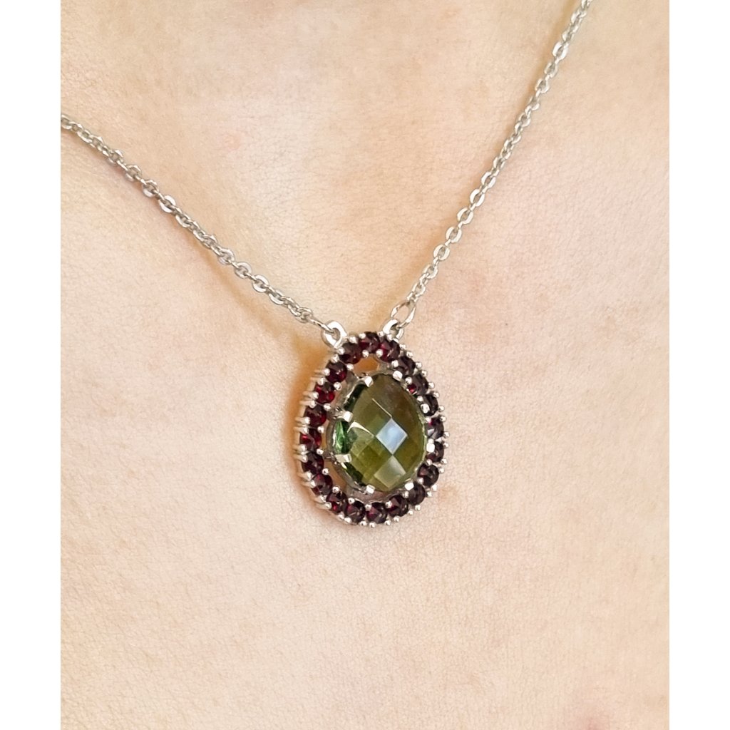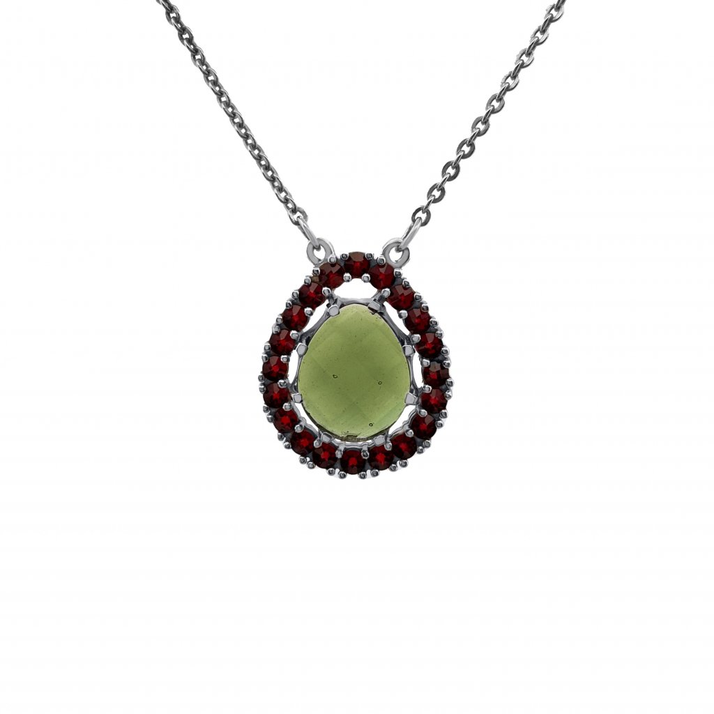 Stříbrný náhrdelník s vltavínem a granáty