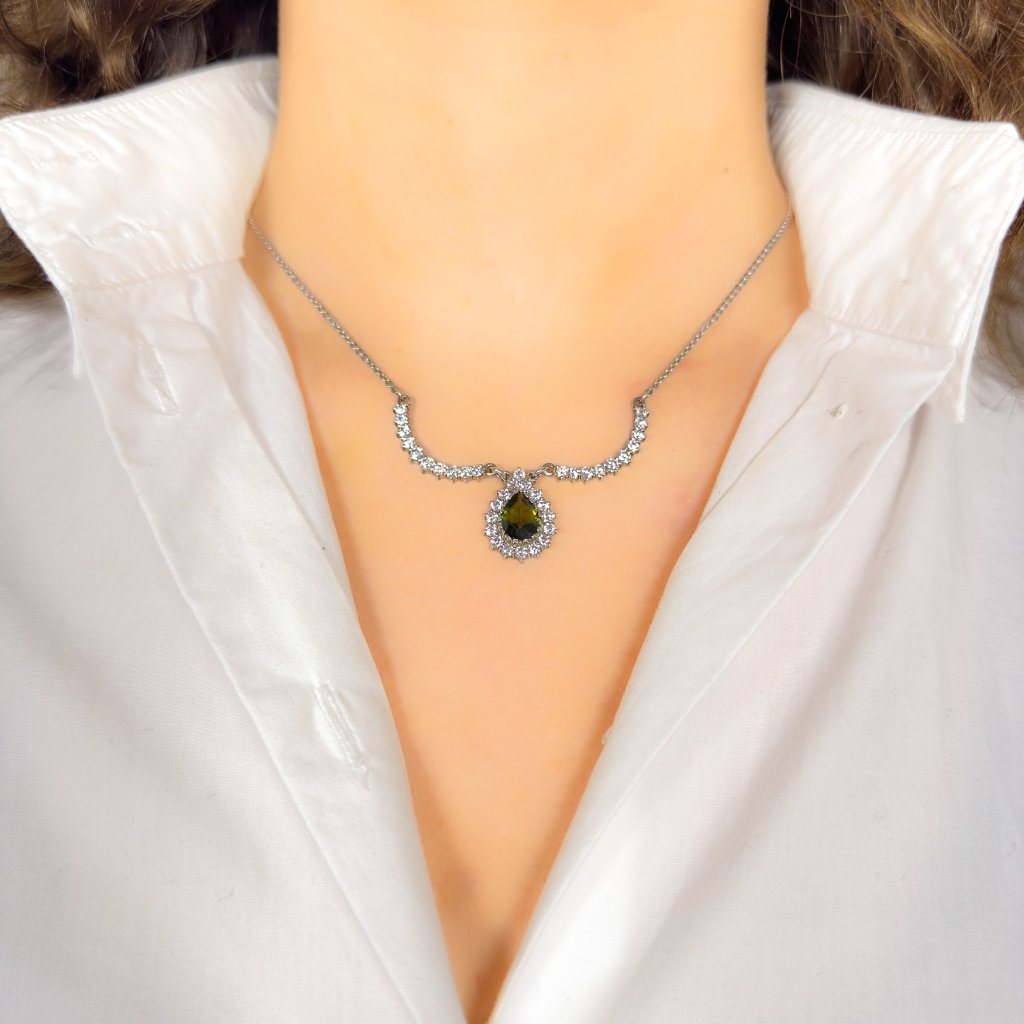 Stříbrný náhrdelník s vltavínem a zirkony P48 0002