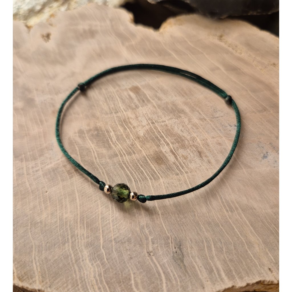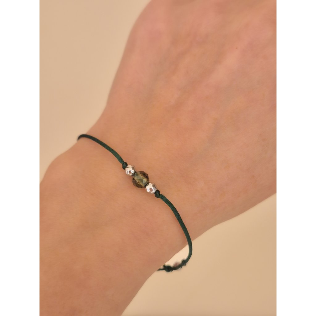 Stříbrný náramek s vltavínem na šňůrce 19 0034 D