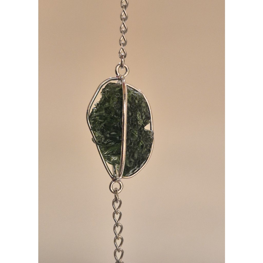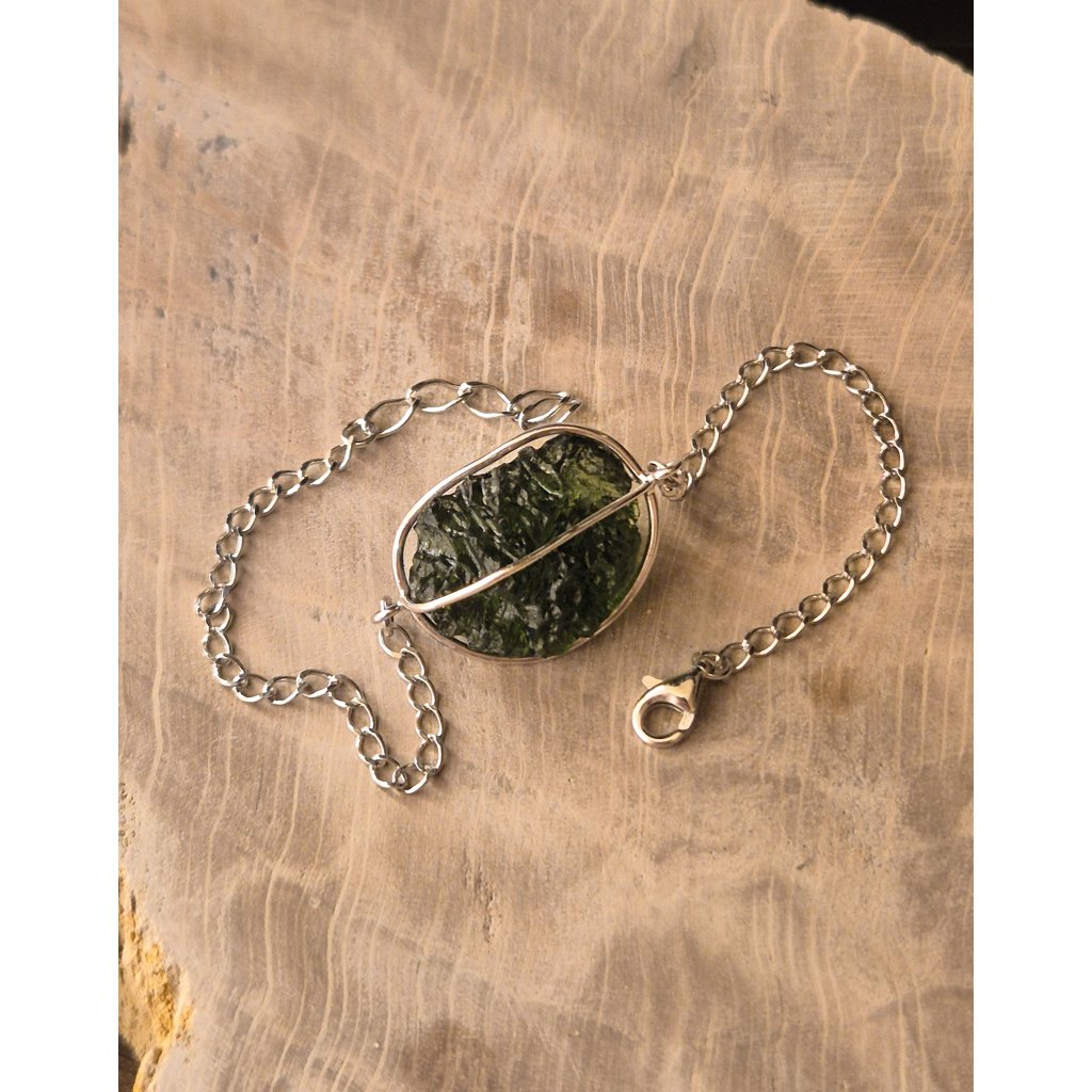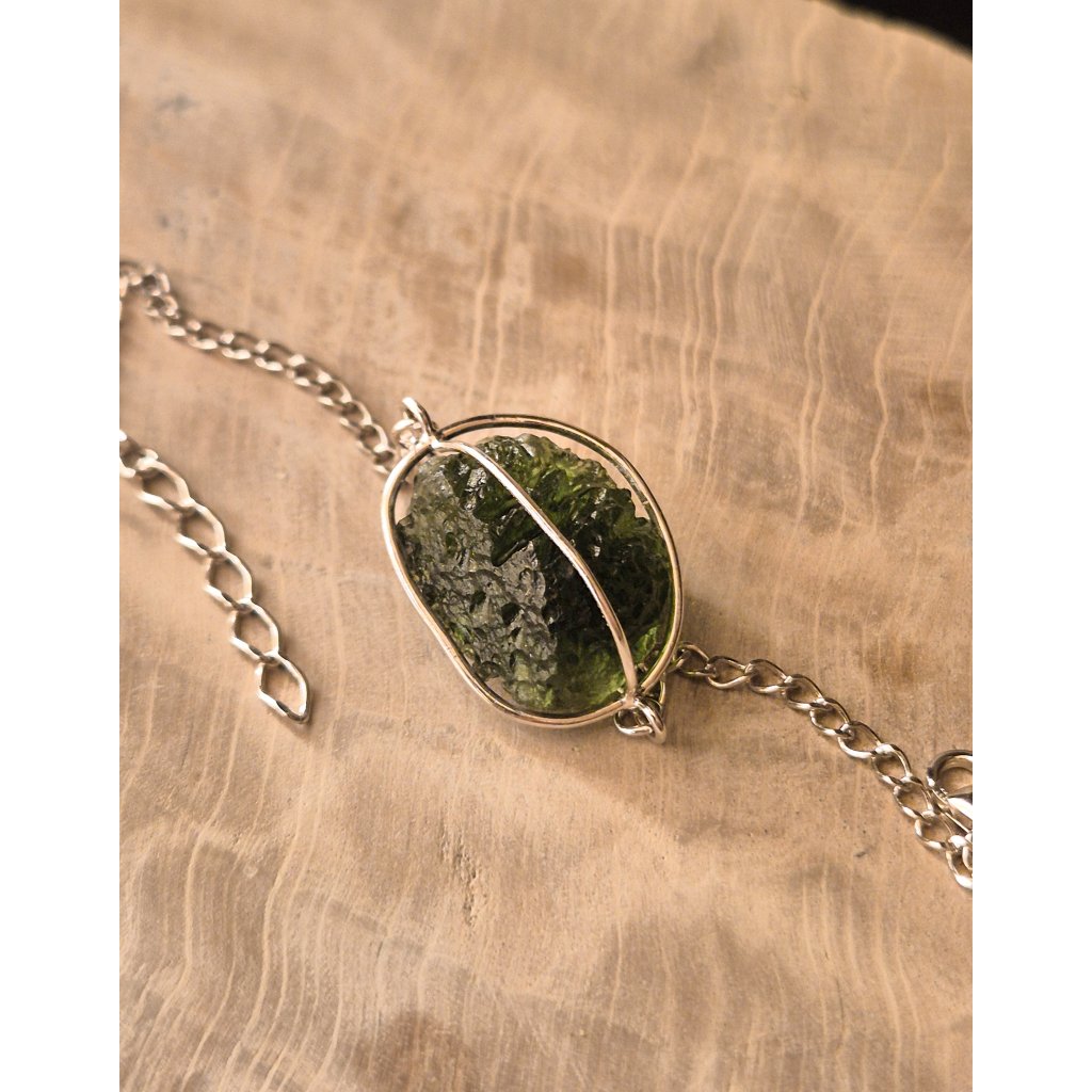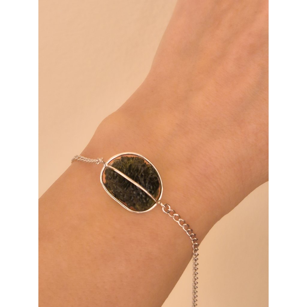 Stříbrný náramek s neopracovaným vltavínem spojuje surovou krásu přírody s jemností ručního zpracování. Každý kámen je originál, stejně jako Vy.