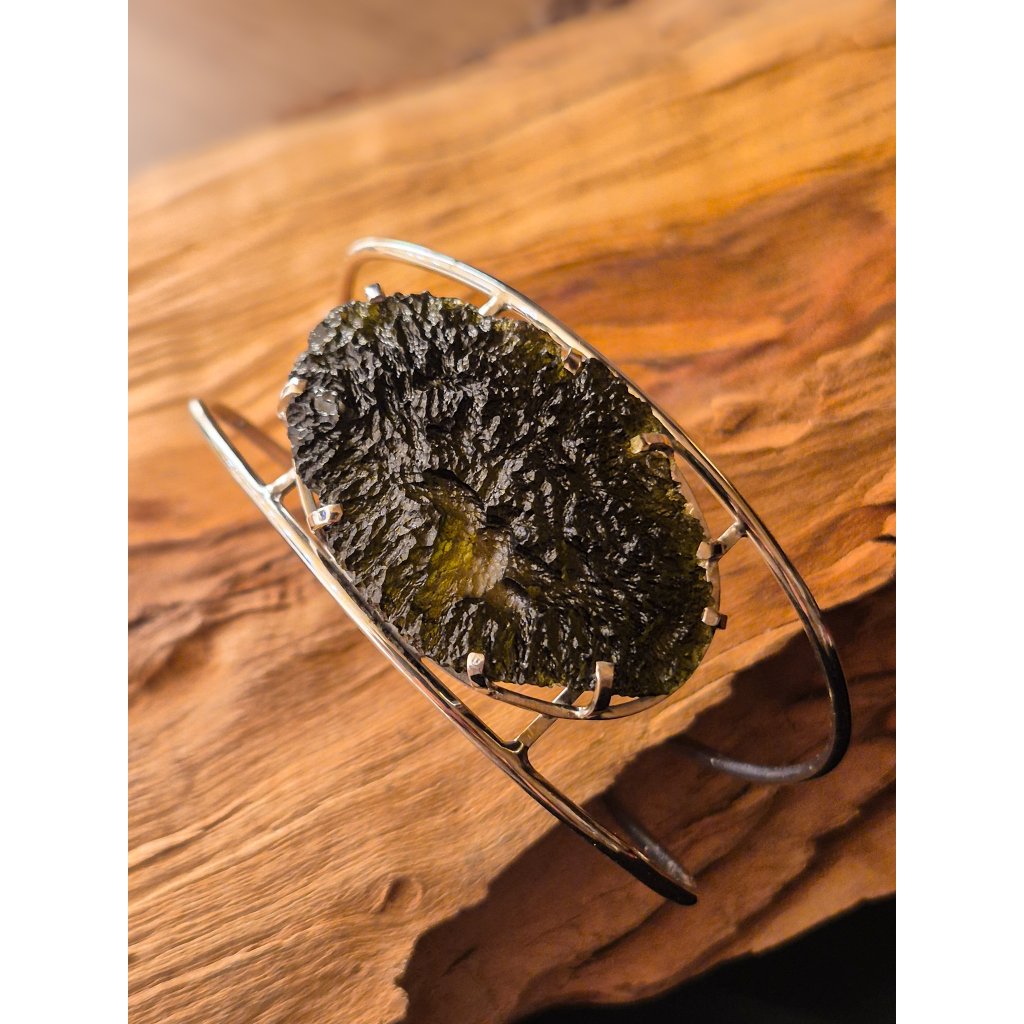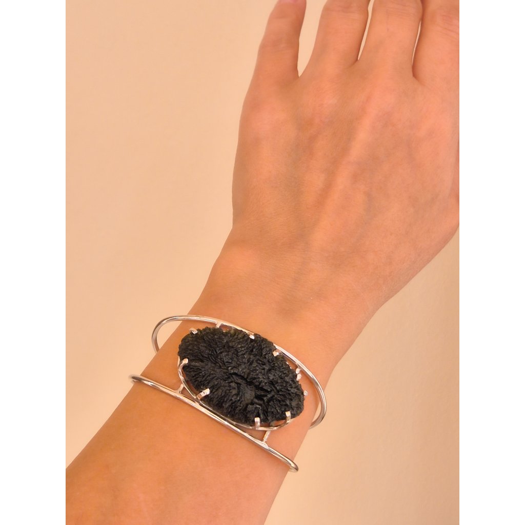 Unikát, který promlouvá – Velký náramek s nebroušeným vltavínem je silným symbolem osobní energie a výjimečnosti. Každý detail ruční práce z něj dělá opravdový solitér.