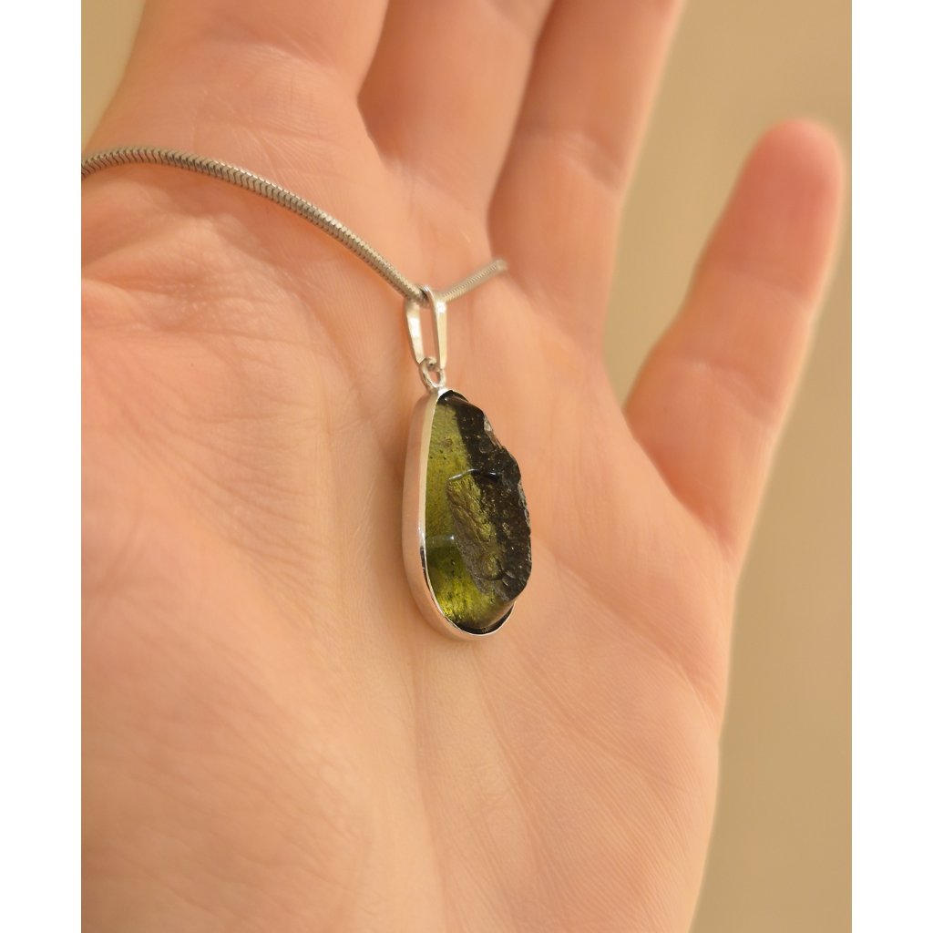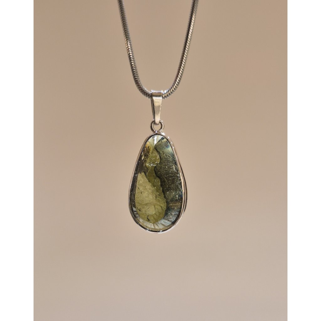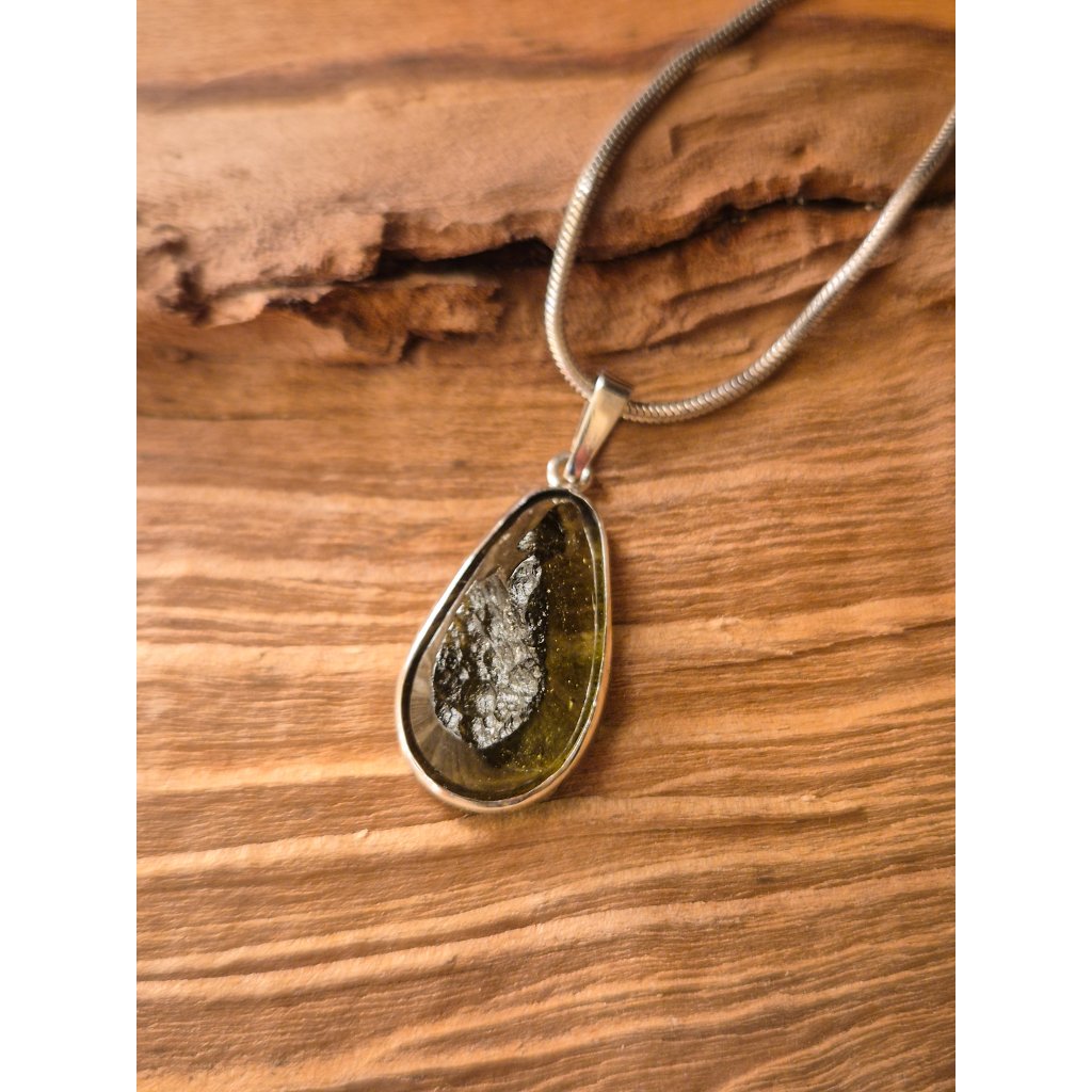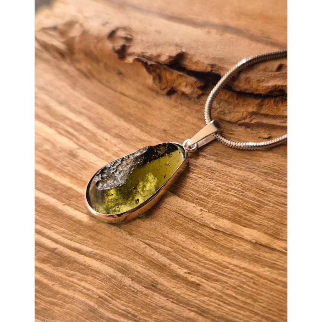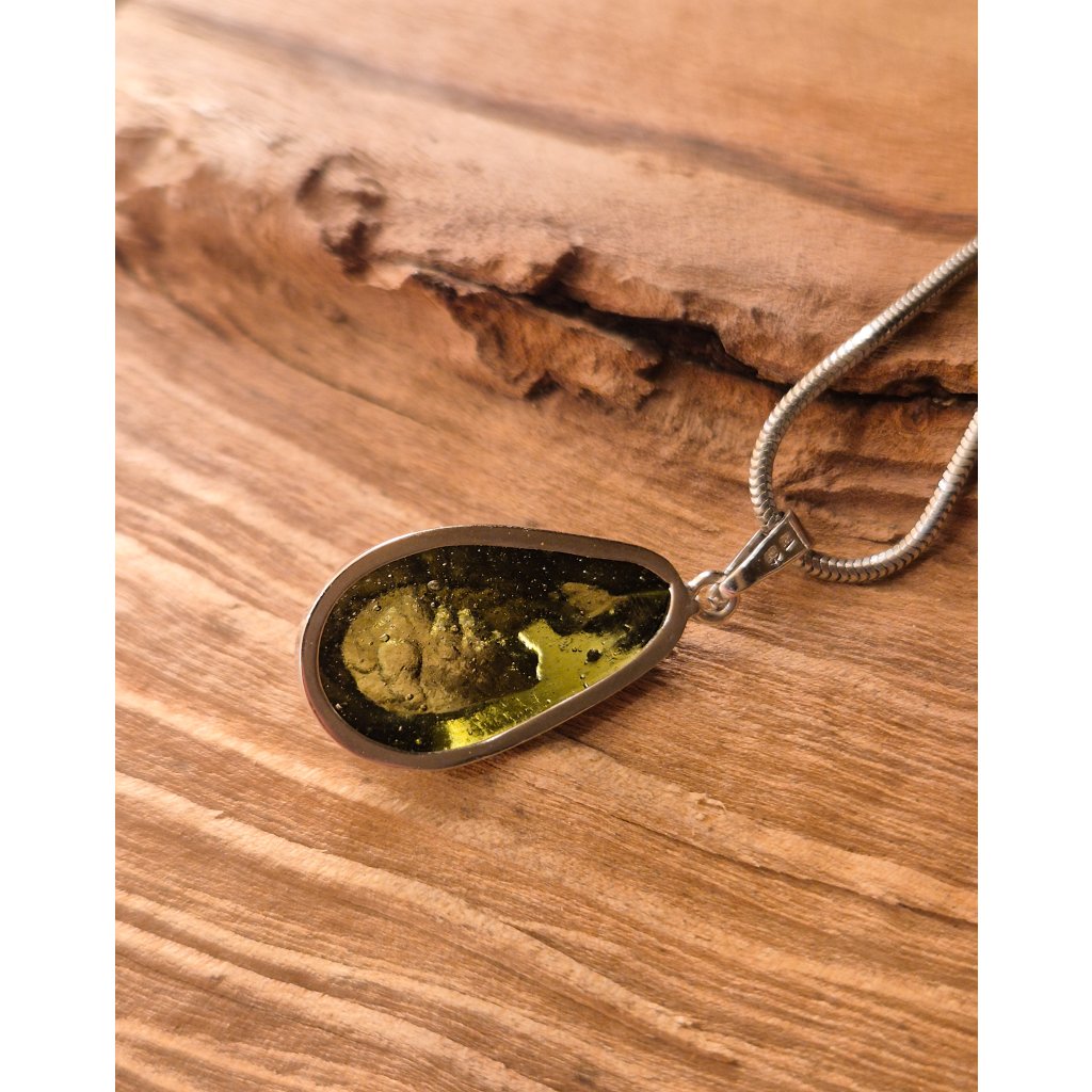 Tento stříbrný přívěsek je důkazem, že i drobné úpravy mohou zachovat duši kamene. Polobroušený vltavín září přirozeným leskem a hloubkou.