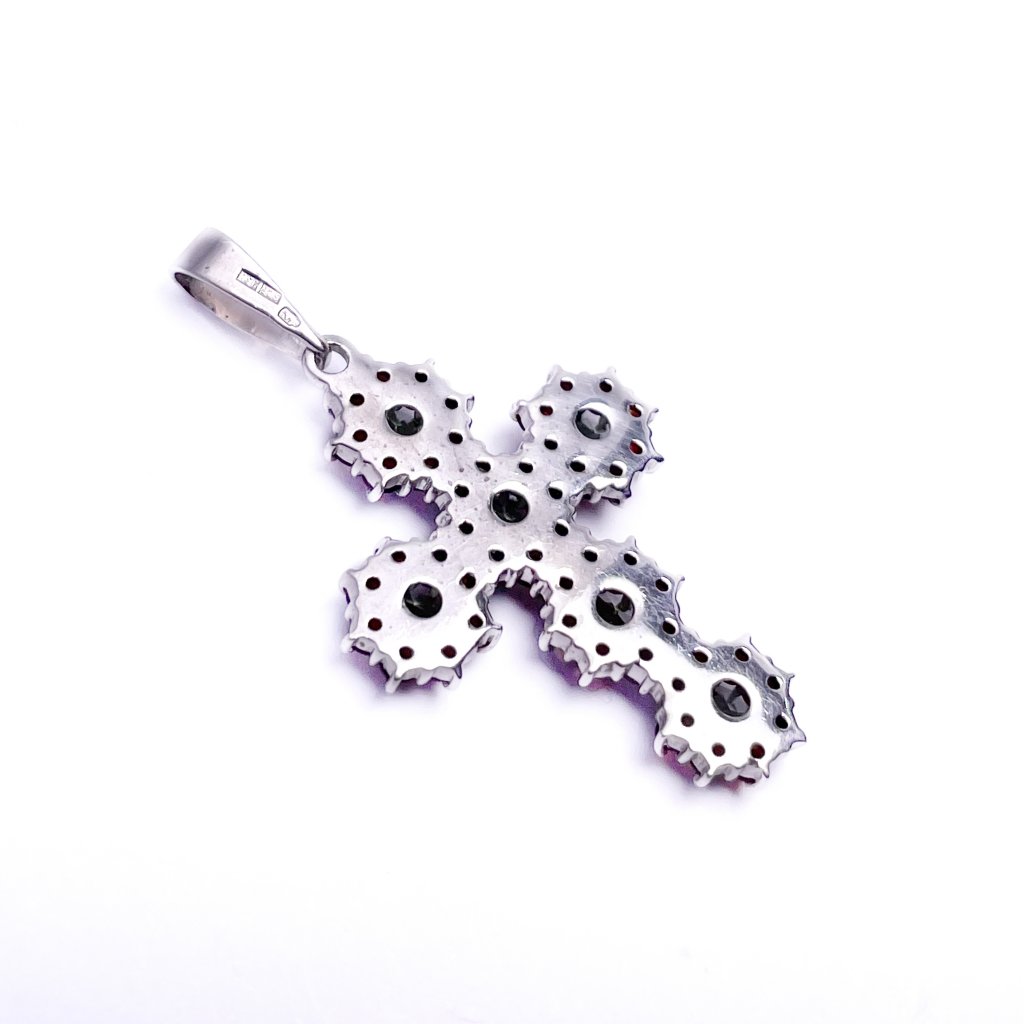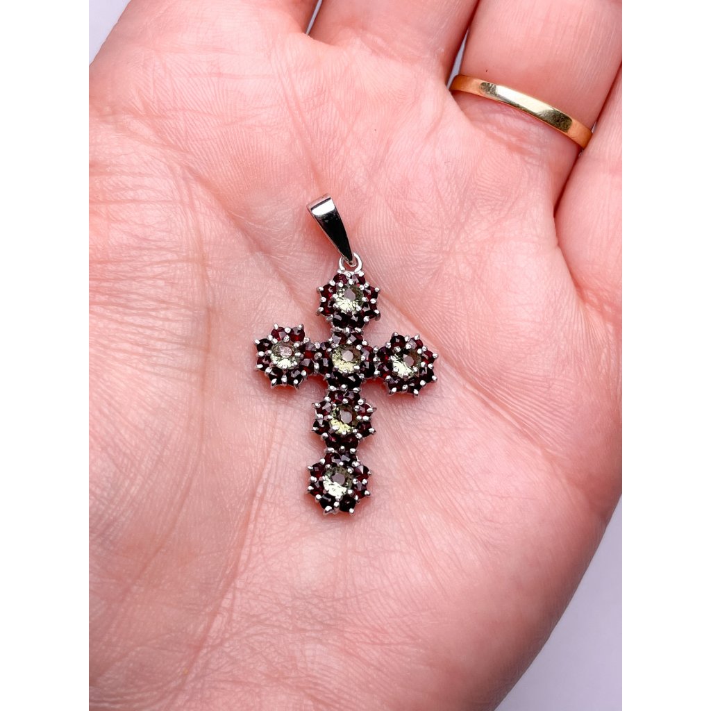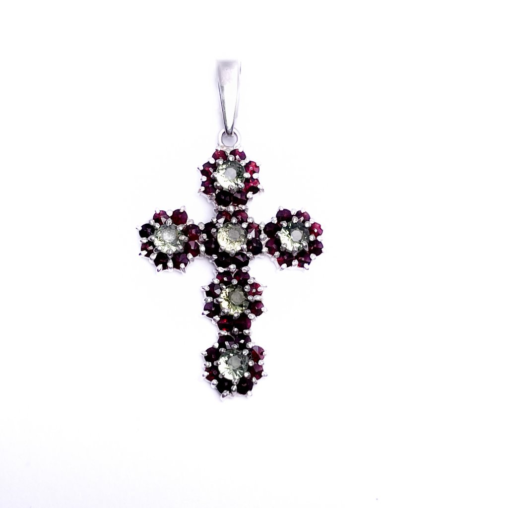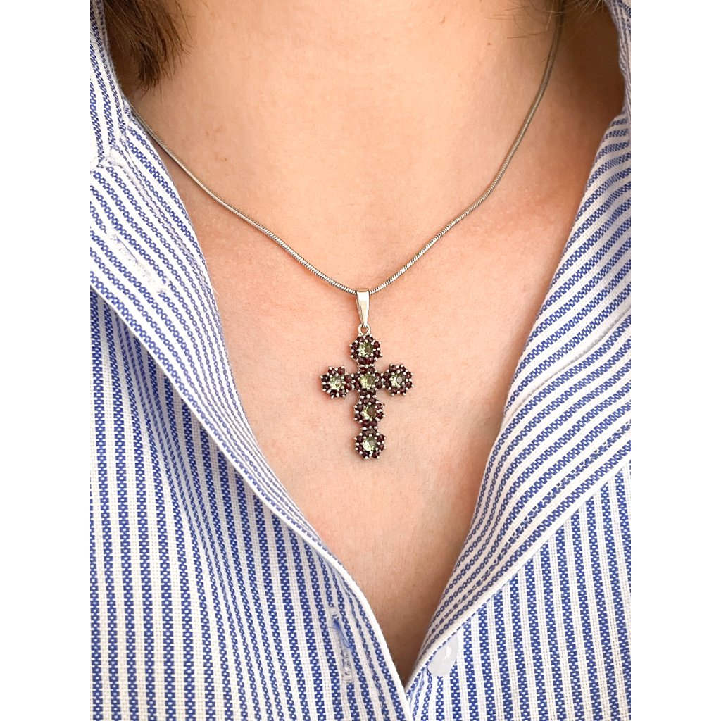 Stříbrný přívěsek kříž s broušenymi vltavíny a granáty 2000185340005