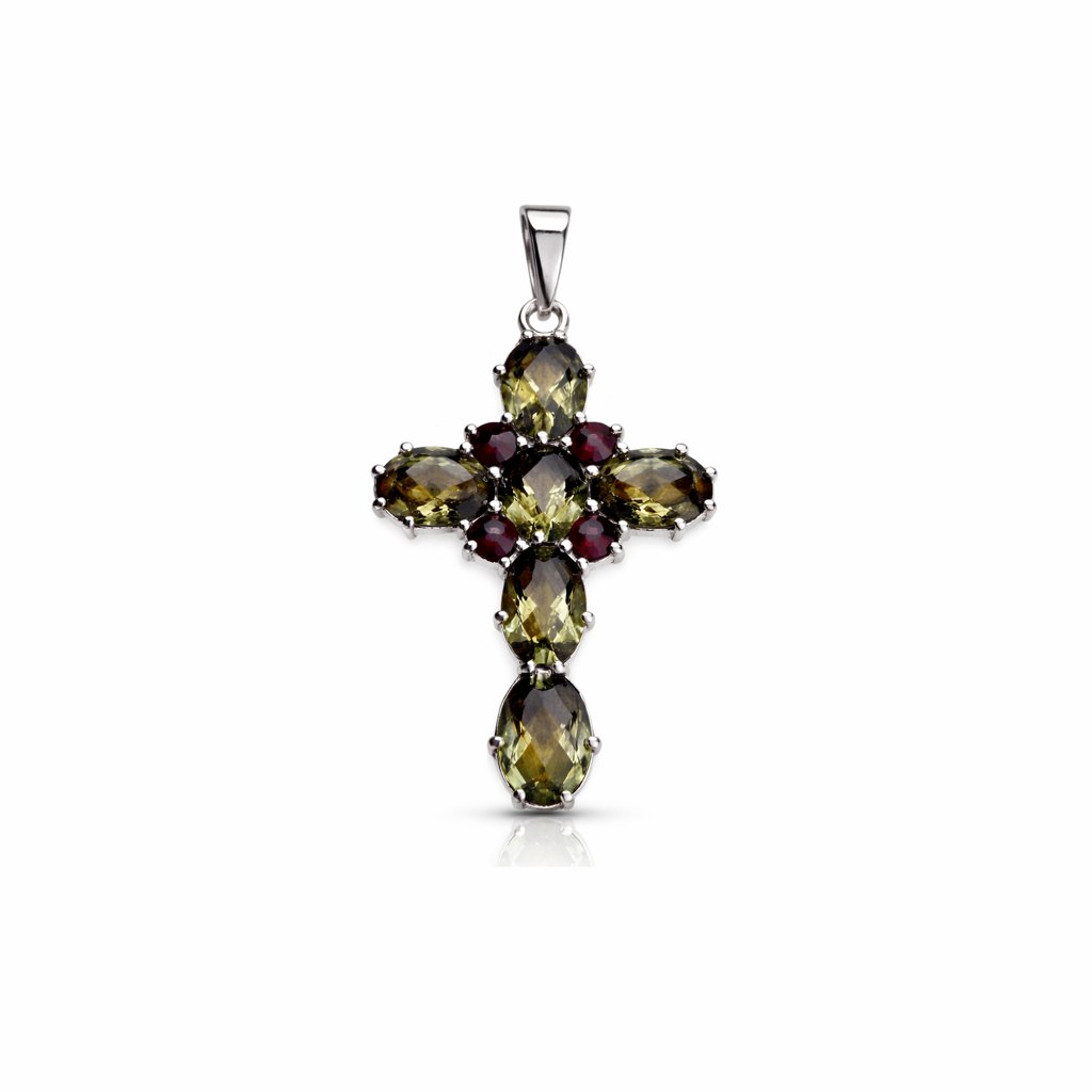 Stříbrný přívěsek kříž s broušenymi vltavíny a granáty 2000339200001