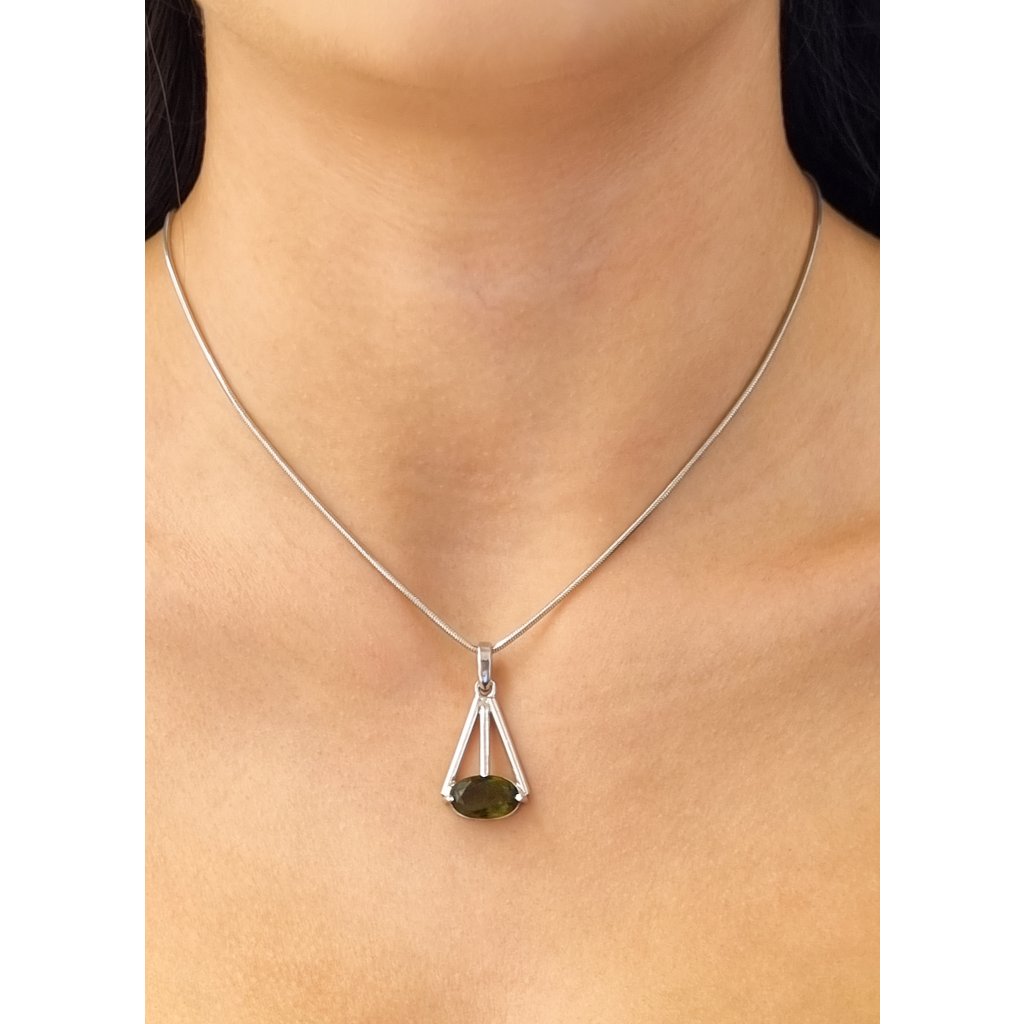 Stříbrný přívěsek s oválným broušeným vltavínem kombinuje eleganci přírodního vltavínu s moderními geometrickými liniemi,