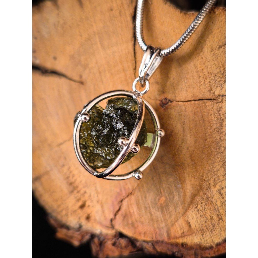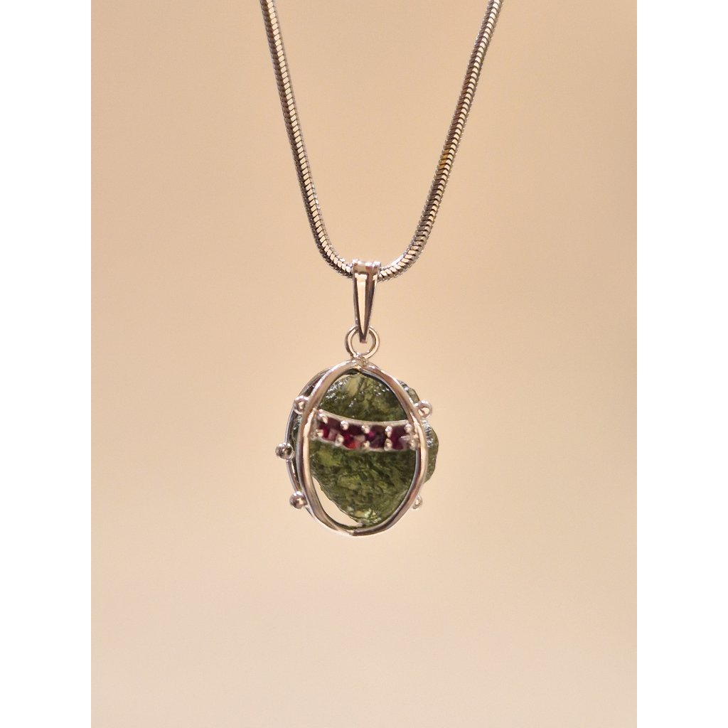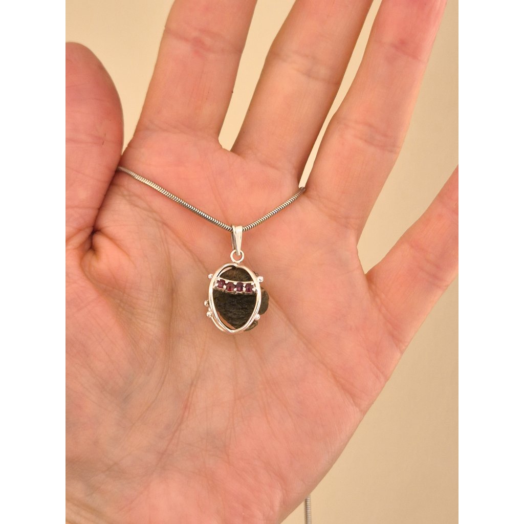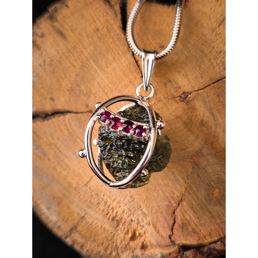 Stříbrný přívěsek s neopracovaným vltavínem a granáty P37 0240