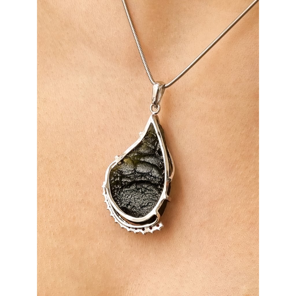 Velký stříbrný přívěsek s vltavínem a granáty představuje elegantní klenot. V jeho spodní části jsou umístěny granáty, které zdůrazňují krásu celého přívěsku . Vltavín ve tvaru kapky korunuje celý přívěsek a dodává mu jedinečný šarm. Tento šperk je vyjádřením jemného umění a šikovnosti řemeslníků. Svému nositeli přináší nejen krásu, ale i příběh spojený s bohatou historií a tradicí českého šperkařství.
