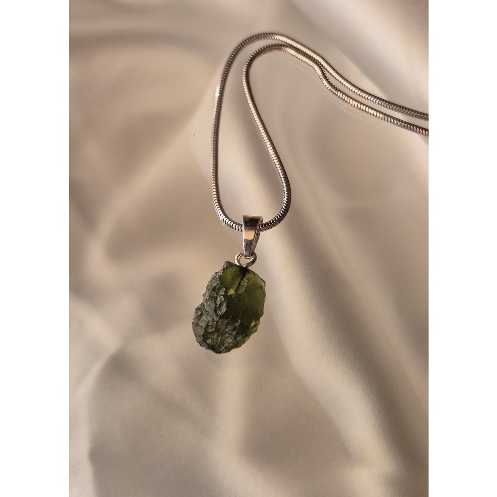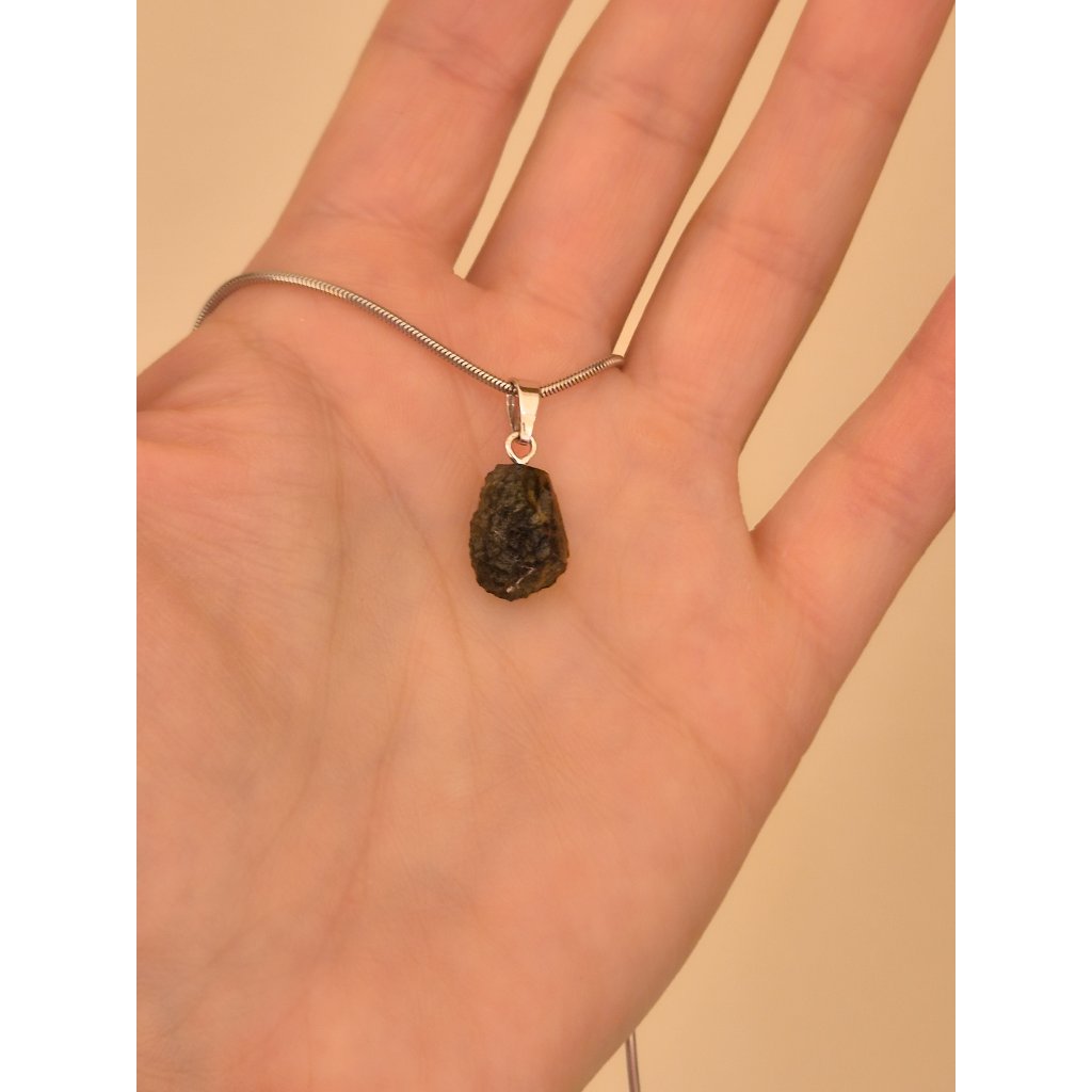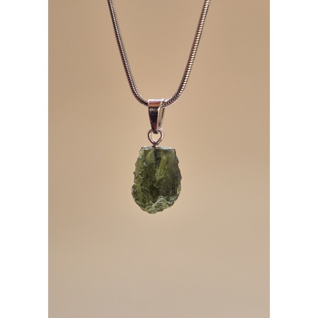 Tento šperk spojuje hluboké přírodní odstíny se stříbrným leskem. Syrový vltavín se mění s každým paprskem, a tak působí stále nově a nečekaně.