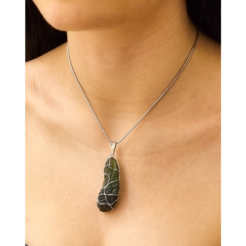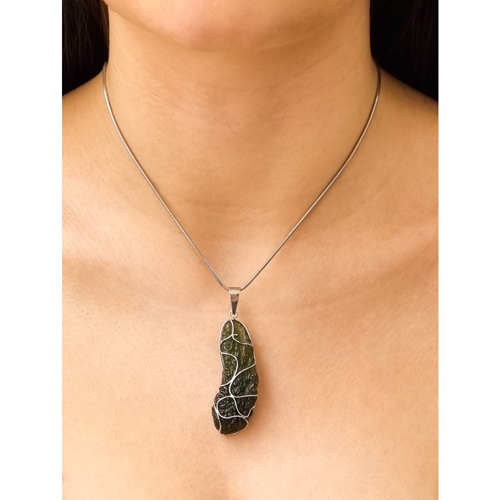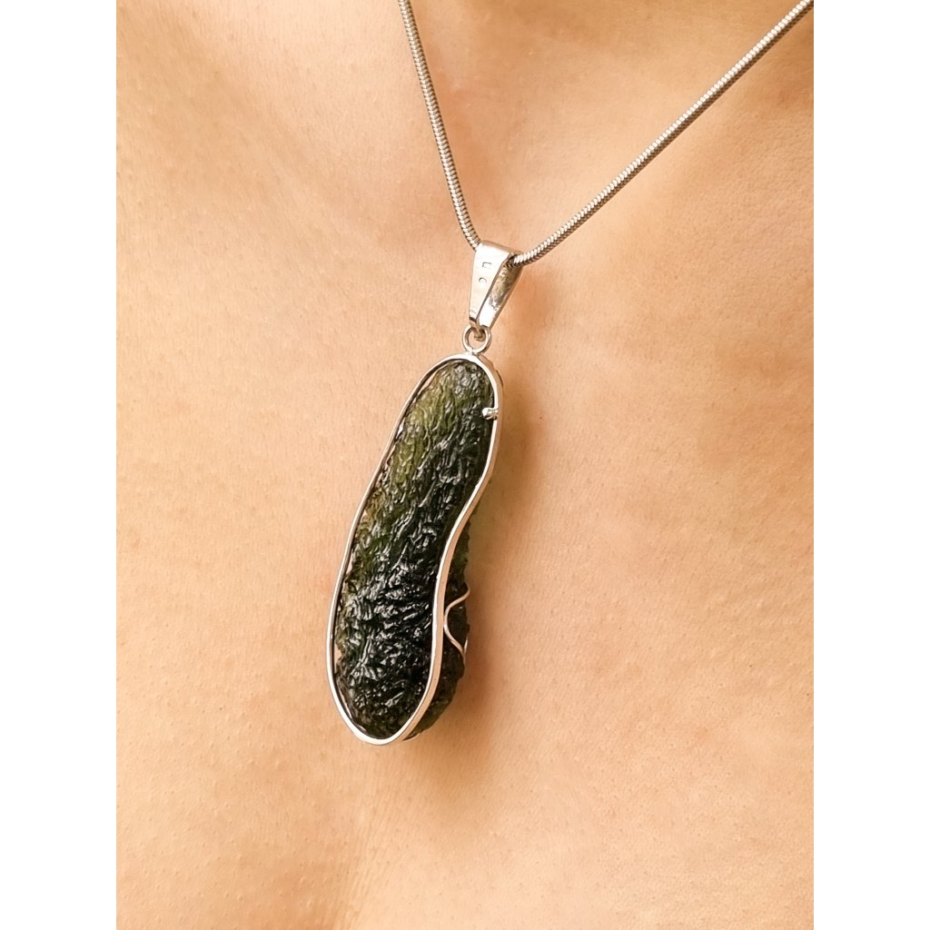 Výrazný přívěsek s nebroušeným vltavínem a lesklým povrchem je úchvatným spojením přírodní krásy a elegance. Jeho nádherná barva a unikátní tvar přinášejí do každého outfitu osobitost a šarm. Ideální doplněk pro ty, kdo milují velké přírodní šperky.