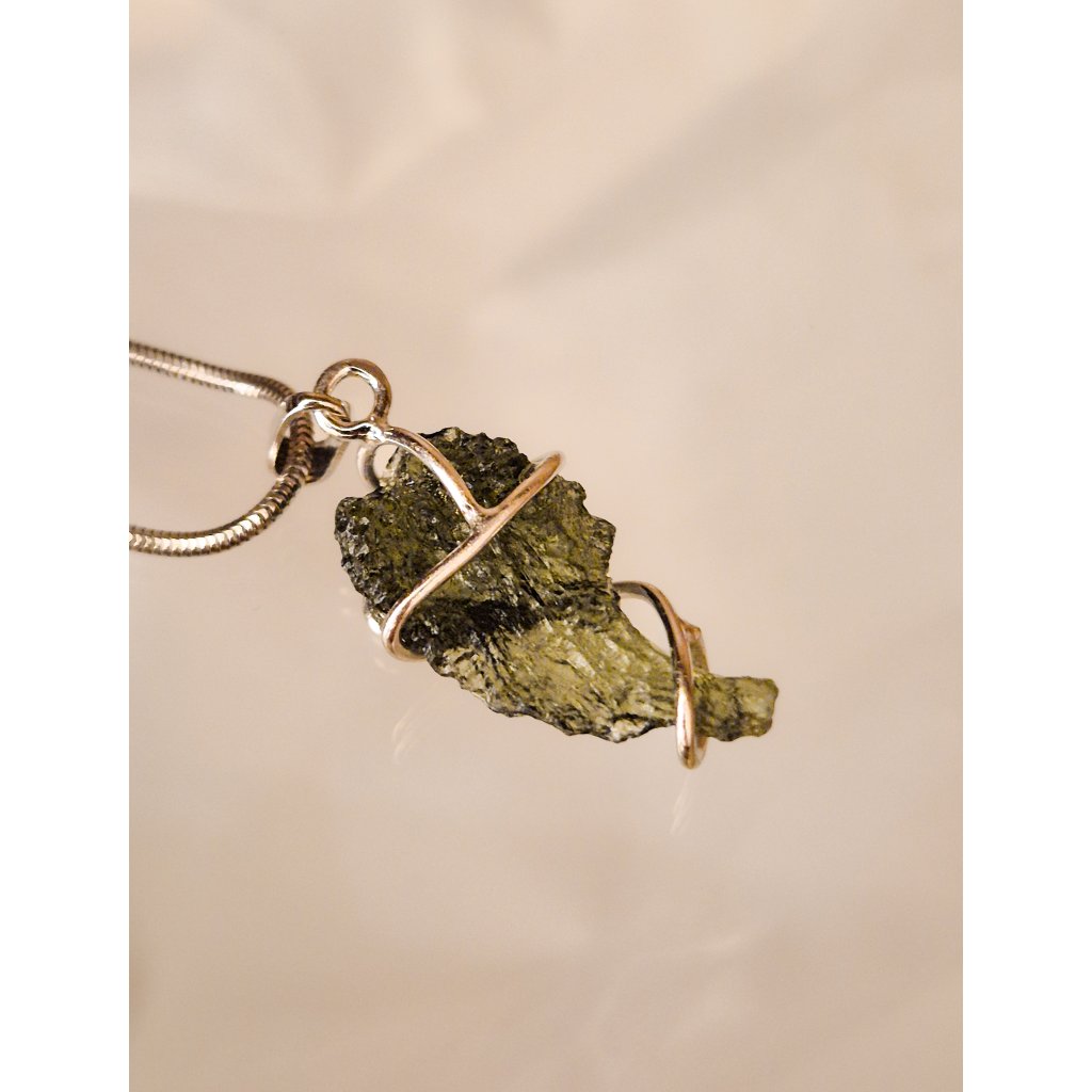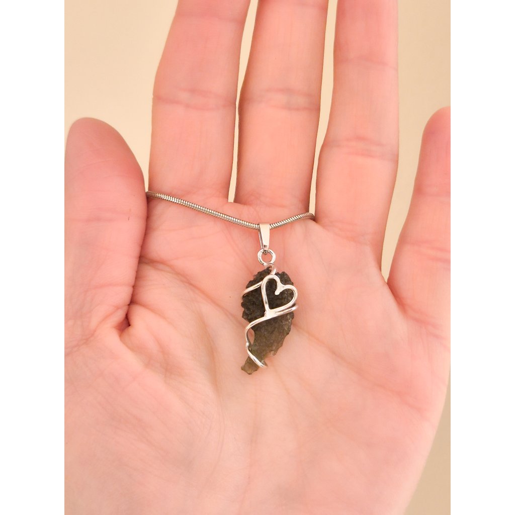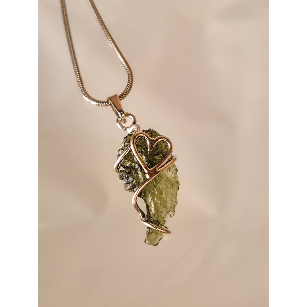 Nebroušený vltavín ve stříbrném objetí srdce– divoká, nespoutaná krása, která vás pohltí.