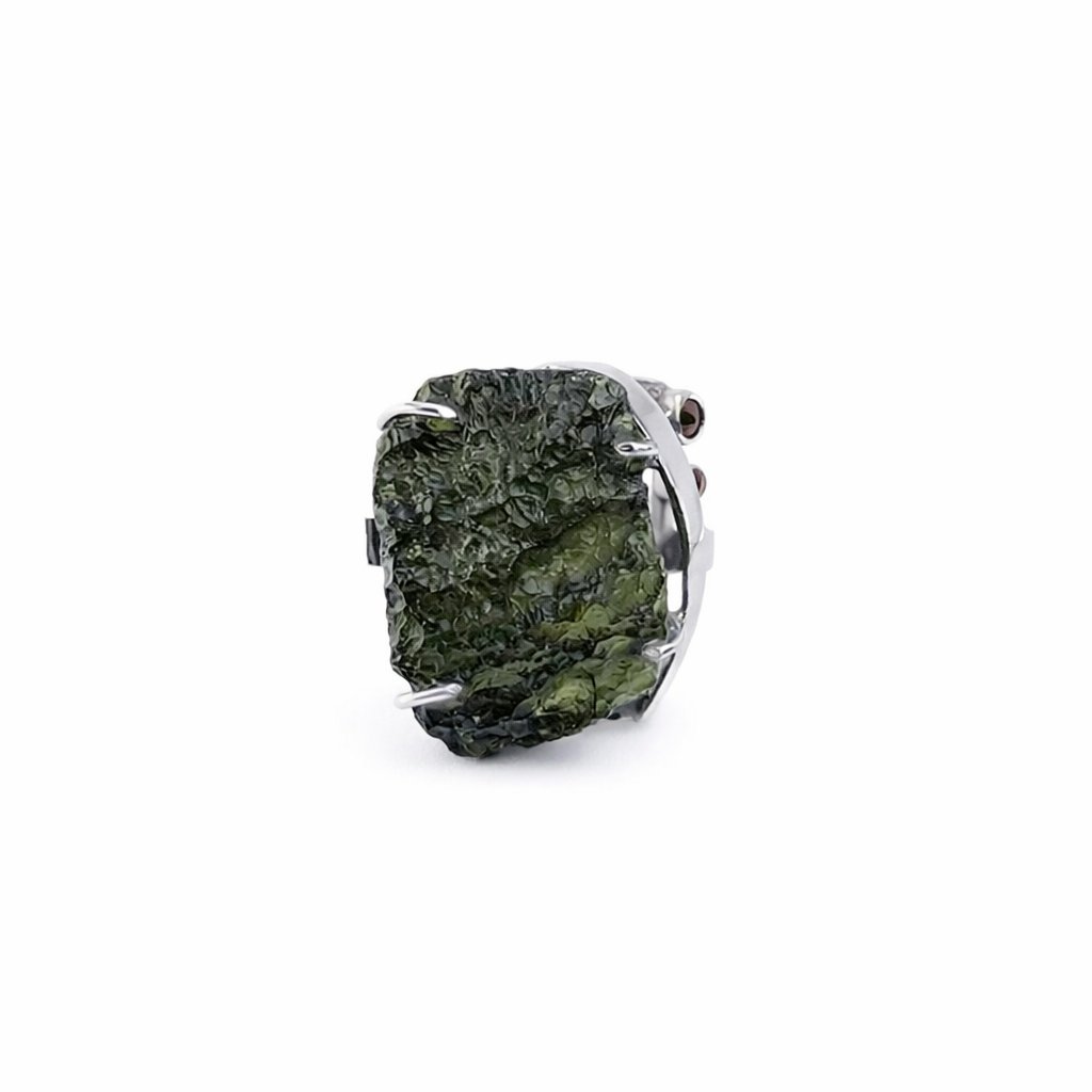 Zajimavý prsten s nebroušeným vltavínem, doplněný dvěma malými granátky. Pro milovníce originálních výrazných šperku.