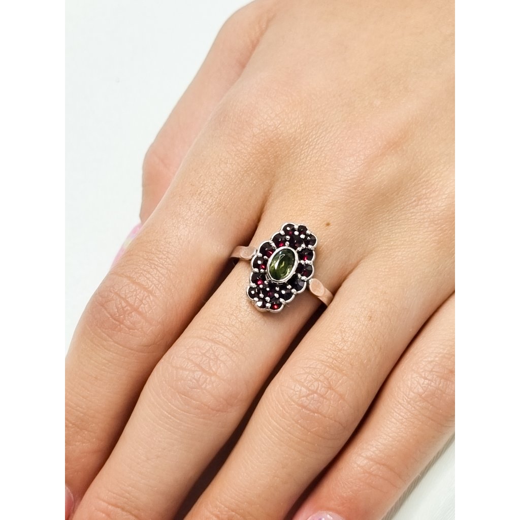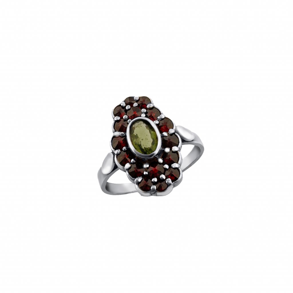 Stříbrný prsten s vltavínem a granátem P45 0030